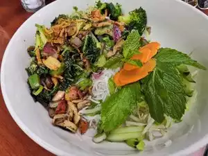 The menu selection is impressive, however, the server was stressed and it showed. Not wanting high sodium, hi fat, we opted for the pho. The noodles were clumpedin the bowl, a very small amount of basil that was not fresh. The sprouts were good and crisp. There was such a grease slick on top, it took about a dozen napkins to soak it up. Very salty, no flavour broth. Btw, the coffee was very good, price $3.55 per cup. Maybe the other items were good, won't be back.