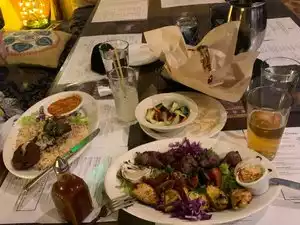 Fantastic dinner! Started with the falafel mezza platter ($24). For mains we shared the shredded lamb rice plate ($25), the eggplant stew rice plate ($21) and the Iraqi beef kabob ($27) We finished with Arab coffee and baklava. Just an absolutely delicious dinner!