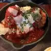 Got seated out in the small patio, but then waited around 20 minutes to be helped, only after we made mention of our wait. By that time, we were ready to order and got the following: Happy Hour mozzarella stuffed meatballs Carpaccio Anti-pasto salad Shrimp scampi with homemade noodles Meatballs weren't stuffed and were a little dry. Server brought a second serving that were supposed to be cheese-stuffed. Nope. Also, the accompanying bread was dry as well. Disappointing. Salad was crisp and refreshing with all the right toppings and a tasty vinaigrette. Carpaccio too was beautiful and light topped with capers, lemon and parmesan shavings. Yum! The absolute best was the Chitarra con Scampi: "handmade chitarra pasta + fire roasted pomodoro + prawns + bay scallops + scallions" Scallops were perfectly cooked, shrimp nice and juicy and the sauce excellent. All atop some handmade noodles, which really makes all the difference. The server was nice and gave us some tips for our travels.