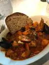 This relatively new restaurant/bar/oyster bar may be better suited to an evening visit, when I’m sure it’s even more lively than at lunchtime. The service was spotty, although the young staff were well intentioned and very friendly and accommodating. The lunch menu included appetizers, salads, sandwiches, and entrees. (The day I was there, no soup was on the appetizer menu.) The food is slightly pricey, although not exorbitantly so; my French dip sandwich was $18 and OK; cioppino, which was offered under entrees, was $32. The wine list is ample; the lowest price per glass is $12. The decor was attractive, although there are a couple of different levels, requiring navigation of stairs. There is ample parking and, with validation, is free for two hours.