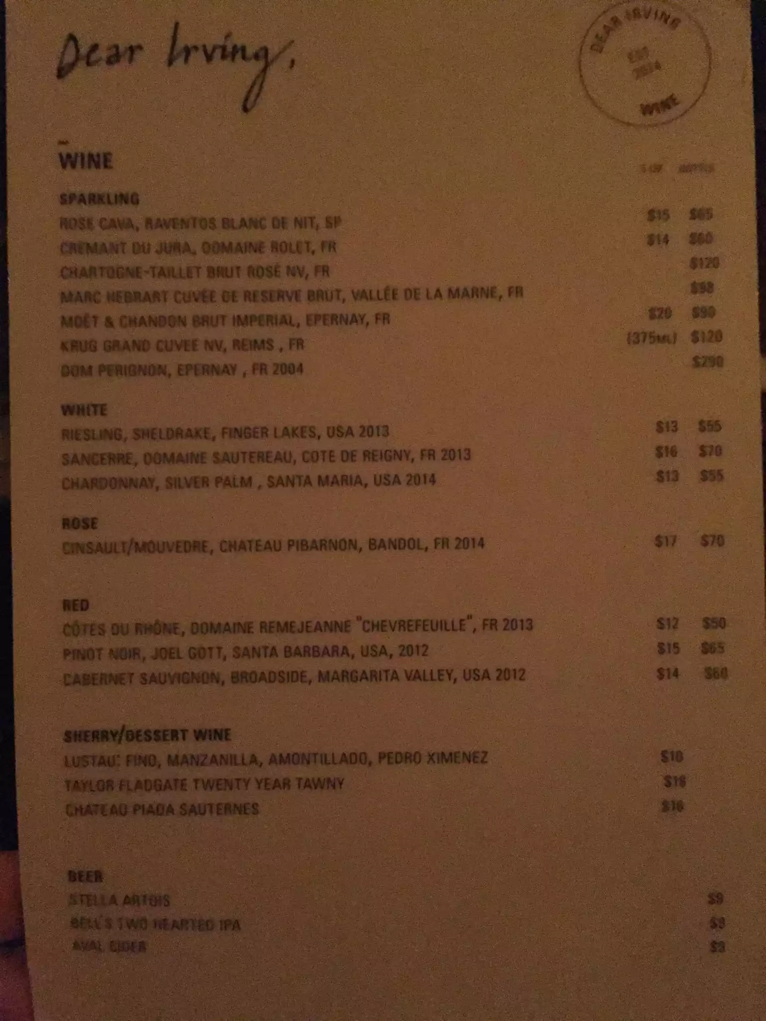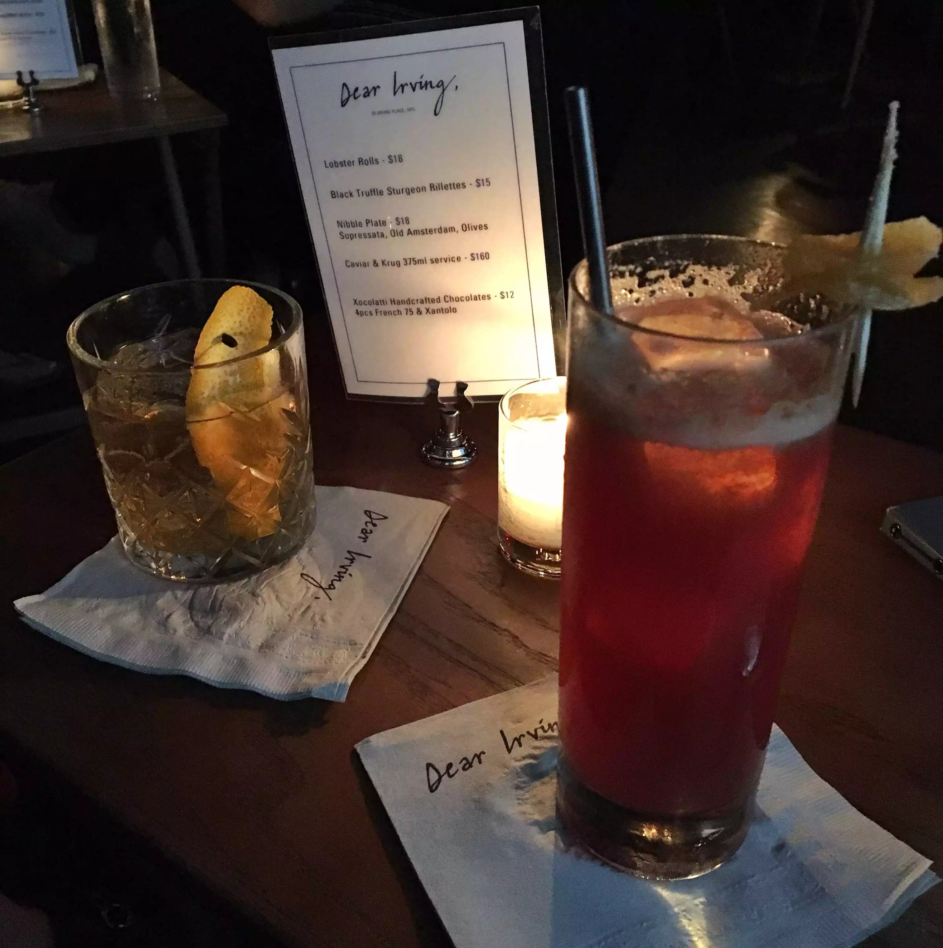 Dear Irving had a bit of a Hollywood feel where the music is not too loud that you can't hear the people you are with, but loud enough that you can't really hear the people around you. It also had that crowded but not too crowded feel to it. I had a couple of old fashioneds, and thought they were pretty good. I would definitely go back. Seems like a very good place for a date or smaller intimate group. I would definitely make a reservation even if you are just having drinks at the bar.