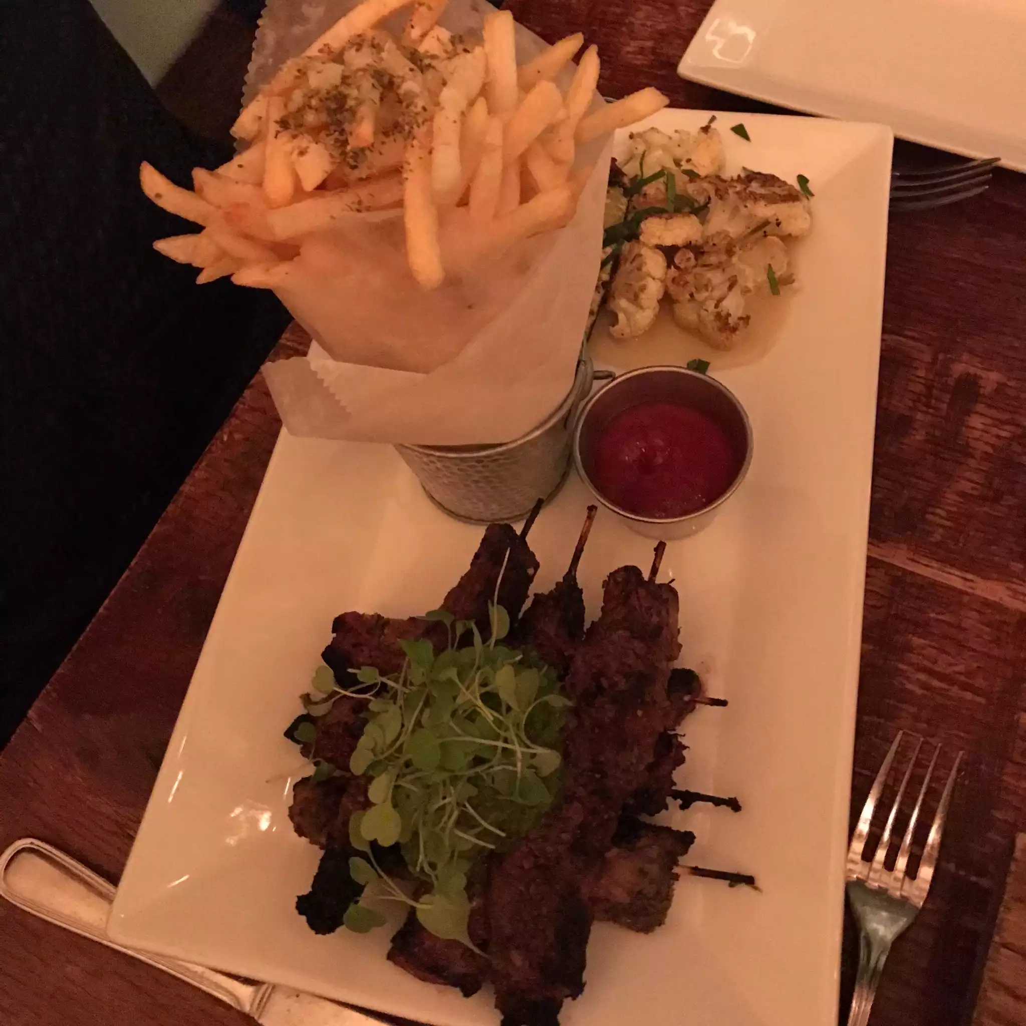Went for dinner and they sat us in a "private" booth. That was pretty nice as we were busy talking and didn't bother anyone around us. I was disappointed to see the limited menu. Waiter was attentive and came back several times to see if we were ready. We were with a friend we had not seen in about two years and we were really chatting up a storm. We finally ordered . We had the rib sandwich, skirt steak skewers, roasted cauliflower, and shrimp tacos. DO NOT ORDER the Rib sandwich. It had very little meat and that was burnt and the bun was full of sauce. YUCK!!!!!!!! The fries that came with it were ok. The four skirt steak skewers were plentiful but were fatty and not cooked enough. The three shrimp tacos were fine. Again the staff was very nice, but you're there for the food and not the staff....