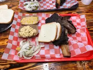 Great BBQ and the staff is great. We had the brisket, very moist, ribs, meaty and fall off the bone tender, sausage was spiced nice. Sides we had the potato salad and the sweet potato casserole which were great. Not an upscale place but I came to eat BBQ, it was very clean and yet quaint. They have bands a couple of time a week and you need to call for reservations. Nothing is over smoked just a nice gentle taste, BBQ sauce was good if you need it, I prefer mine with a small drizzle.
