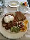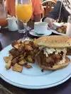 We went here on Sunday..but couldn't get a reservation till 2 p.m. The chicken sandwich was big and filling. The "fruit salad"? Was a few partial melon balls in a little dish..terribly disappointing...and even at $3.95 seemed overpriced. Definitely need some work on that! The cheese blintzes were pretty good. Drinks are very affordable. White table clothes are nice, and the place is still very comfortable so you won't feel underdressed if you arrive casually dressed. Fine for tourists. We were asked if we wanted dessert...but by this time 3:15 p.m. A man was vacuuming near our table. We definitely felt they wanted us out of there. They already had been setting up the tables for dinner. But the vacuuming while we were still trying to have a conversation wasn't a good thing. I suppose they were ready for an hour's break maybe. Supposedly they finished brunch at 3:30. Overall though..the service was fine, and the atmosphere was comfortable. Prices are very reasonable for San Francisco. A good place to bring your relatives who may not be too adventurous...without breaking the bank. Would be good for families. Split the chicken sandwich for two children.. I haven't been in the evening recently, but before their rotisserie meats were good. Will have to try that again. Not gourmet, but pretty good and a bargain in this city!