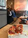 This pizza place had a buzzy activity with communal bench seating. We ordered the hot salami and margarita pizza which were both very tasty, thin crust pizzas. We were in and out quickly, the service was friendly and efficient. Highly recommend.