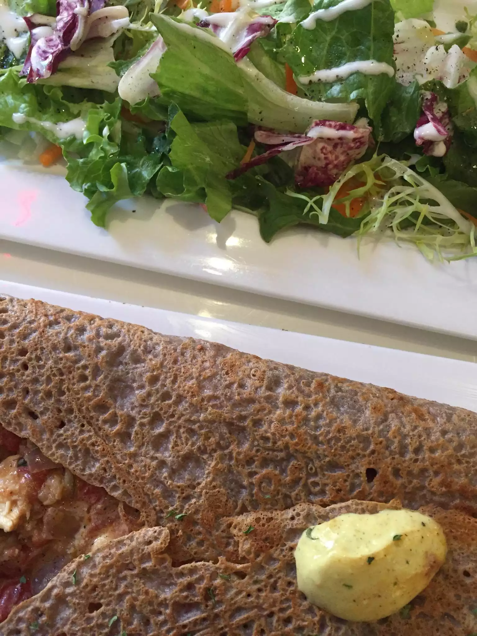 The menu looks promising, with a wide range of crepes, both savory and sweet. Our group filled several tables, so we sample a variety of both types. Actually, they serve Galettes, or BUCKWHEAT, crepes style; thin and fried. The flavor is very different than we expected, especially after many trips to France. The galettes are chewy, with a nutty flavor that some may like. None of these were what we sought. We hoped for a solid old fashion wheat based crepe. The dessert "crepes" make up for it a little. They serve excellent tea and coffee. Service, BTW, is outstanding.