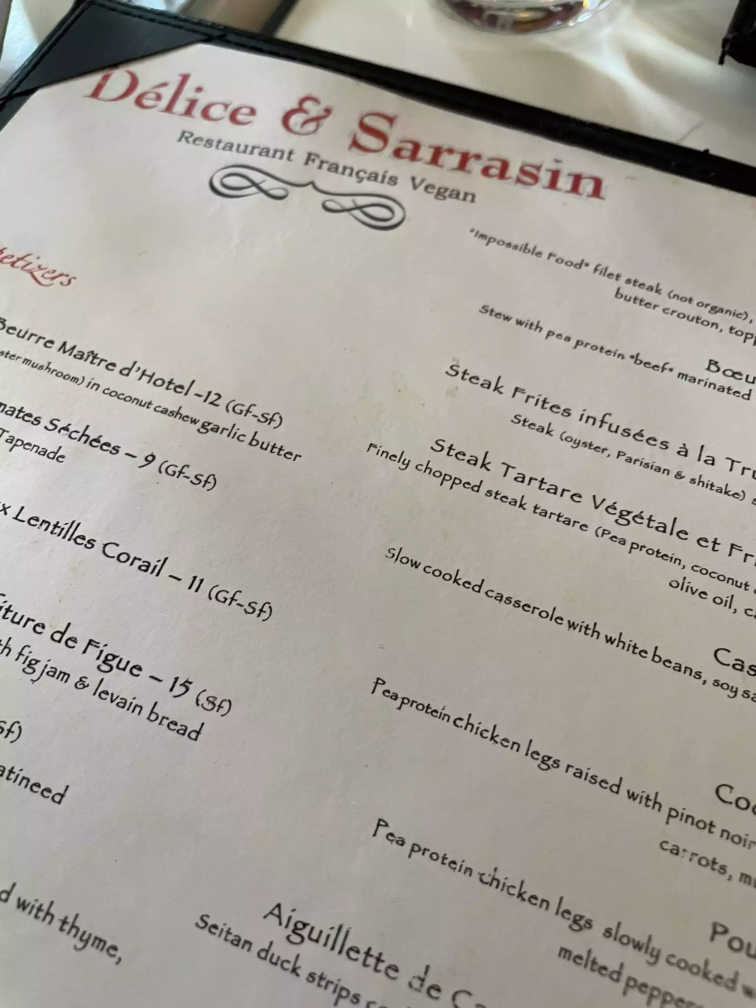 Not a vegan myself but amazingly surprised with flavors texture of dishes imitating traditional French dishes; cheese platter with scrumptious bread, crepe escargots or onion soup followed with beef bourguignon coq au vin or steak frites whatever you select you’ll enjoy And if if still room taste the dessert plus great service