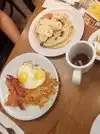 Wited to be seated, waited to have server come to the table and waited for food...yes busy but to be expected and prepared for by staff/management No cutlery, had to ask when food came. No butter for bisquit, had to ask...Food cold, barely edible. Will not return
