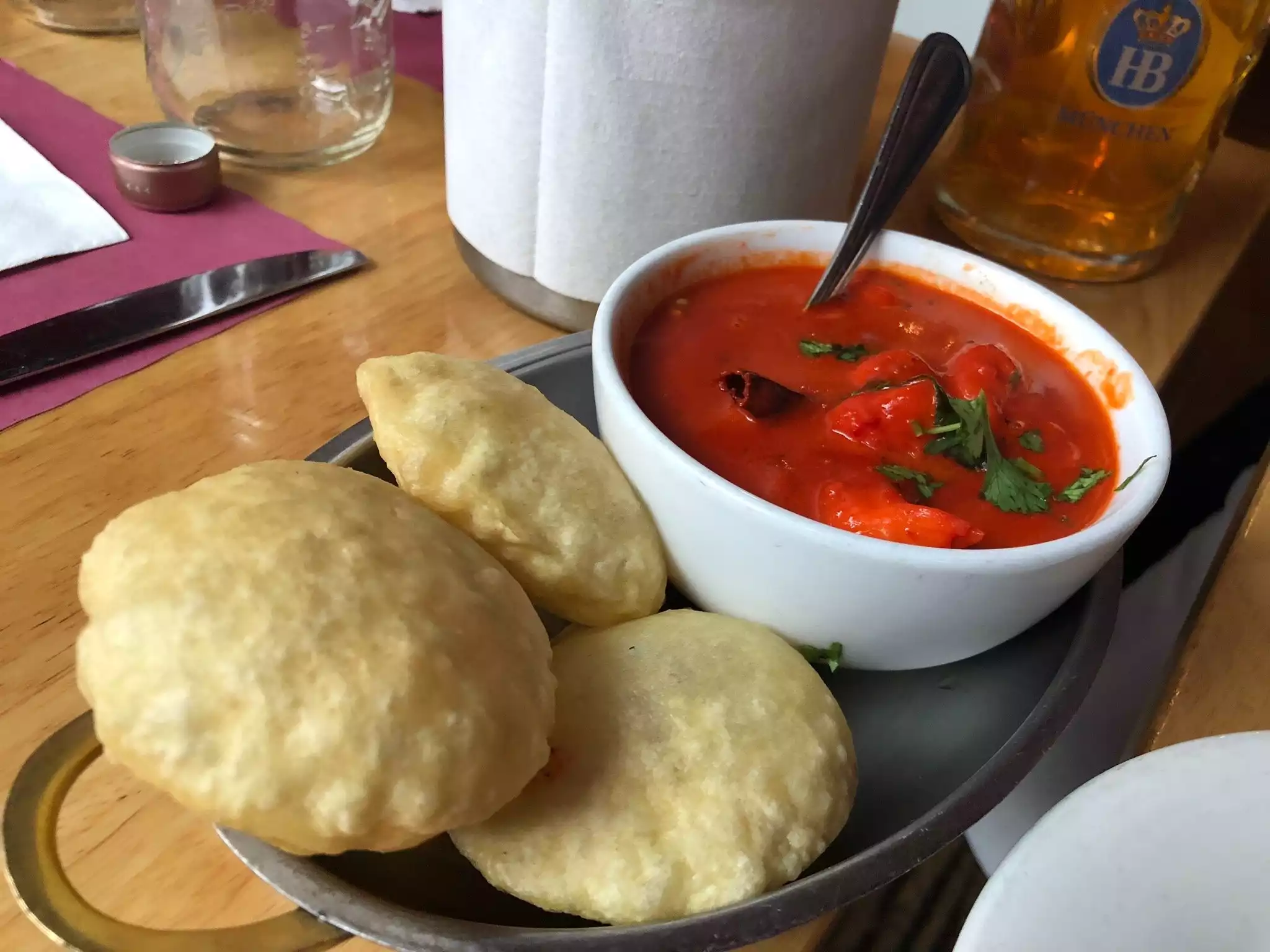 Clean restaurant which is a big plus although there is a sign in the bathroom that says "do not flush paper towels or TOILET PAPER in the toilet"-where do you think that should go? Beer is cheap here, food is good and somewhat spicy. Breads are excellent. Do not overload on apps as the main dishes are better. Stay away from the horrible wines, avoid over expensive cocktails and drink good beer at a very fair price. 2 very large beers , 2 cocktails, 4 apps and 4 entrees and rice for 4 was $ 220 including tax and tip crowded seating and no place to hang coats, bags....