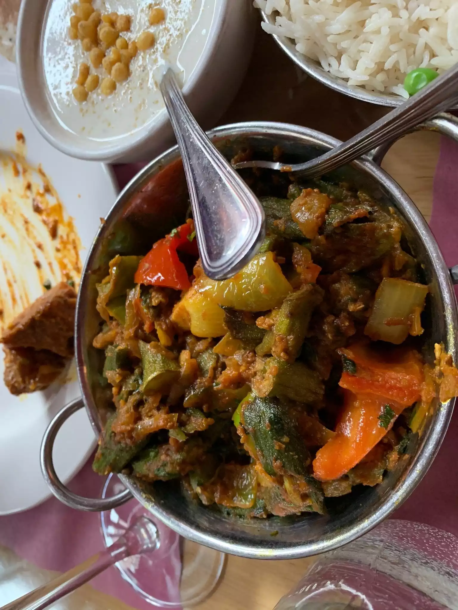 Extensive menu with a nice selection of British version curries in the last page of the menu. Not cheap, but reasonably priced. We had lamb dhansak and a vegetable bhalu - both well spiced and tasty. Somosa was our starter and I was a little disappointed in the crispness of the pastry. Rice was clumped together and let the presentation down somewhat. The physical facility needs a makeover. Missing wall at the entrance, dirty and broken light switch by the door which clanged every time it shut, and tired decor. That said, friendly staff and good food will make for a return visit.