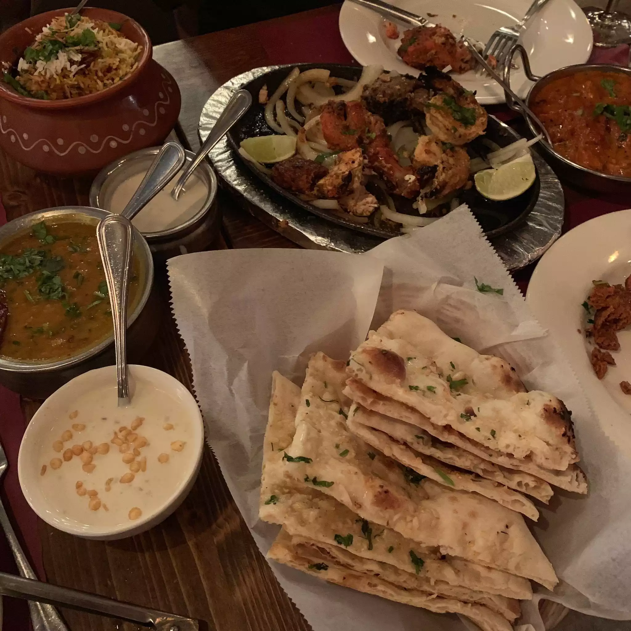 With a friend in town a group of us came here for dinner during the week. We had made a reservation and were seated immediately. We had a lot of different dishes. Their complimentary papadum were delicious, and one of my favorite Indian snacks. The mushroom appetizer was great. The mixed grill is a large portion with a lot of variety, great for sharing. The butter chicken and chicken biryani were both very good, especially the butter chicken. We then got the chicken tikka masala which wasn’t as good as the rich butter chicken sauce. Overall great place and reasonably priced.