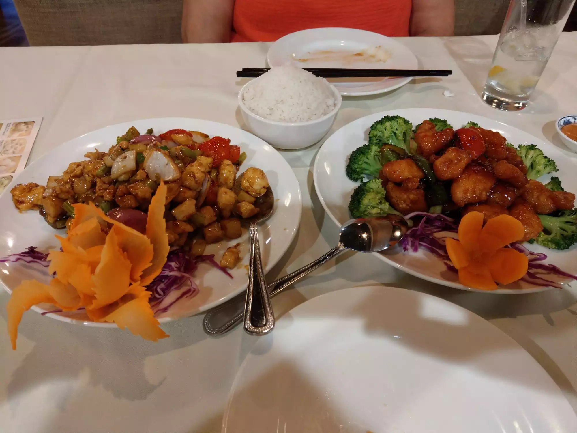 Food actually very nice Fresh dumplings great selection! Chopped chicken on lettuce really superb! Singapore noodles tasty. Just service , removing plates much to soon , reaching over. Touching platesnot empty- just really uncomfortably hurrying thru your meal- Not nice