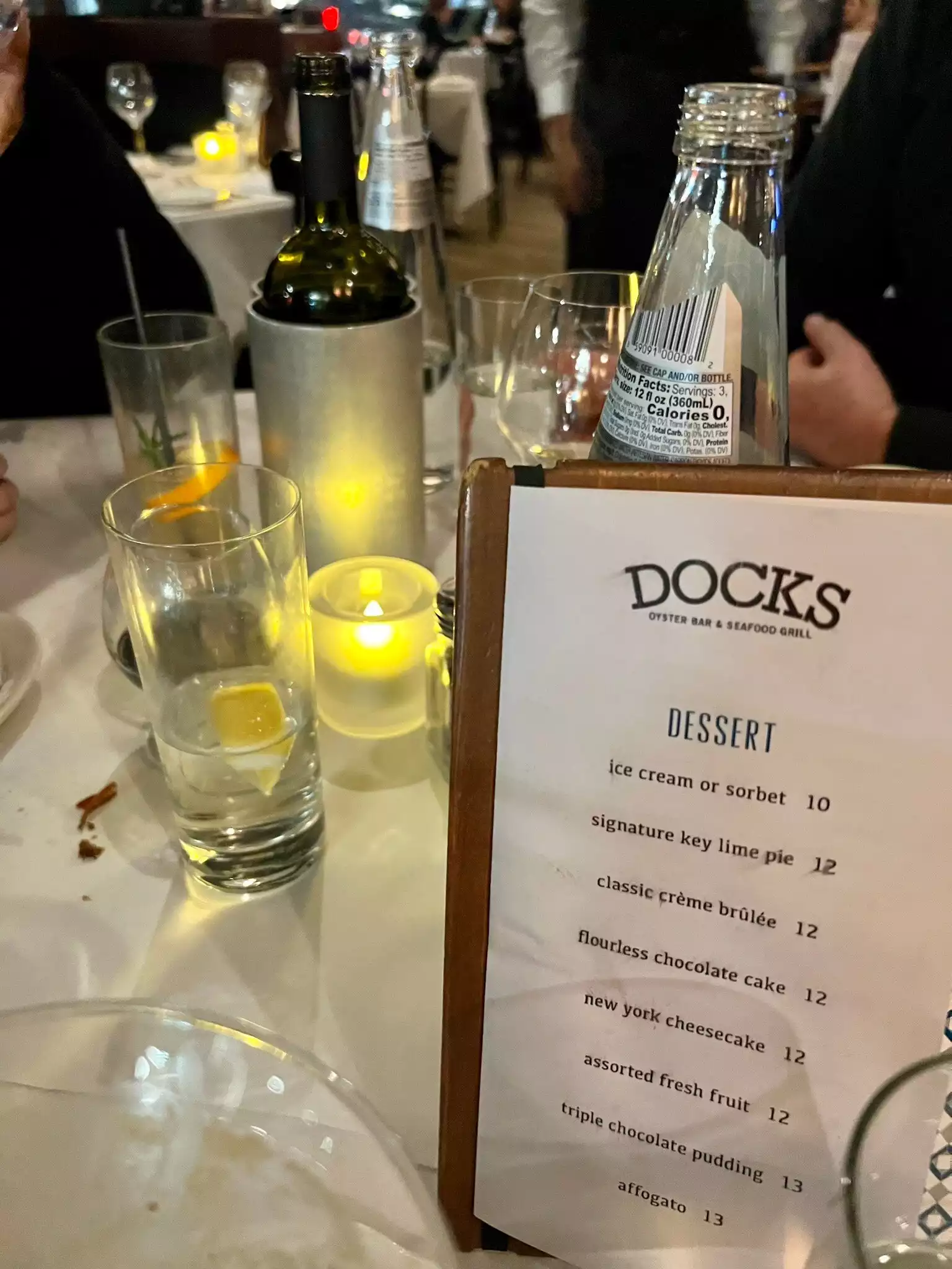 Docks is one of our favorite stops in Manhattan. The atmosphere is elegant, the food is outstanding & the wine list is eclectic. We love their brunch but stopped for dinner tonight. The Atlantic salmon was great. The lobster risotto was rich & creamy. Salads & appetizers were excellent. Our Austrian wine was perfect for the seafood. We finished dinner with the Oreo cheesecake. Great night that was made better by our server, Brandon. We’ll be back!