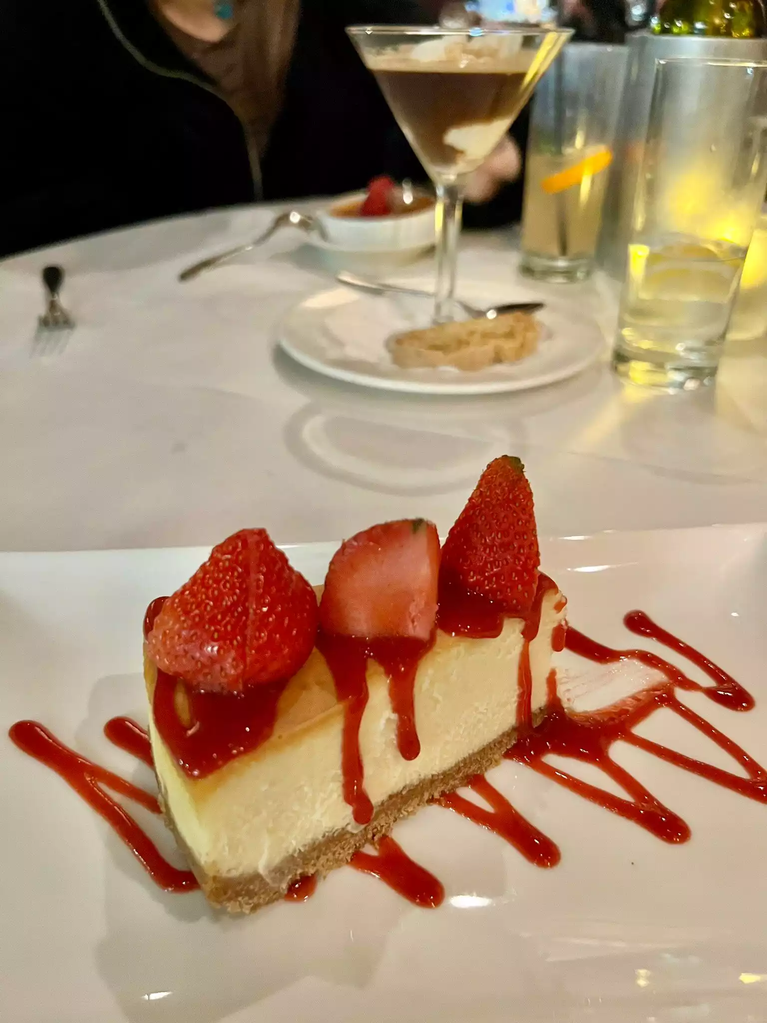 We had the burrata and Parma ham appetizer and the wedge salad. Both were very good. The burrata and ham was served on toast points. The wedge salad was good and the bacon plentiful. For entrees, we had the tuna and the fish and chips. No complaints. The New York cheesecake was not overly heavy which was good. A solid 4 stars. Service was a little disappointing which was the only drawback.