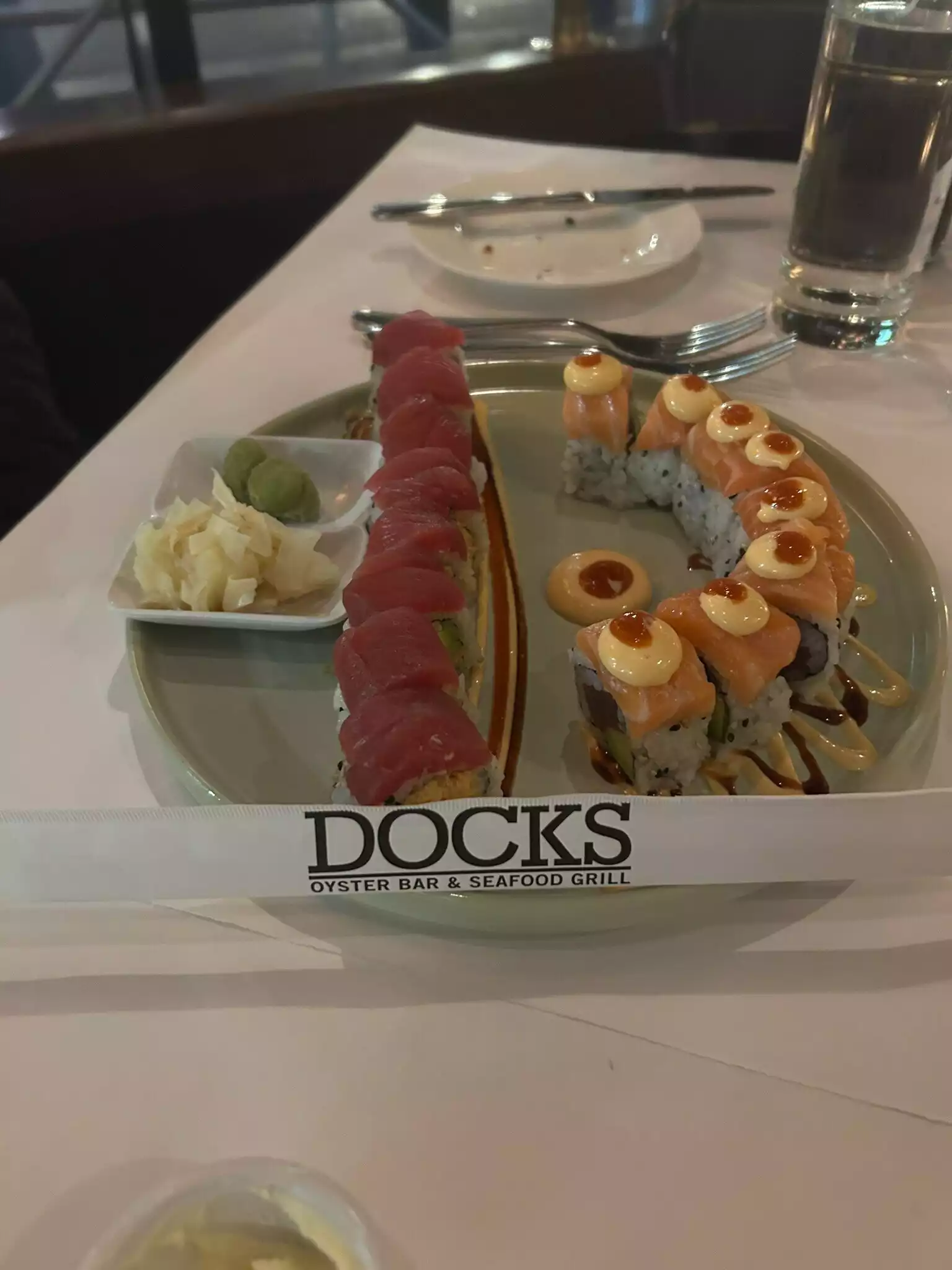 First time dining at Docks. In town on business and had dinner with family who live nearby. Nice atmosphere and decor. Dinner res at 7pm. Arrived at 6pm for a seat at the bar to wait but it’s a busy happy hour bar. Went down the street to Black Sheep instead to wait. Had a nice window front table. Very good service. Crab cake sandwich was delish. Sushi starter was very good. Limited beer selection. Would dine again.