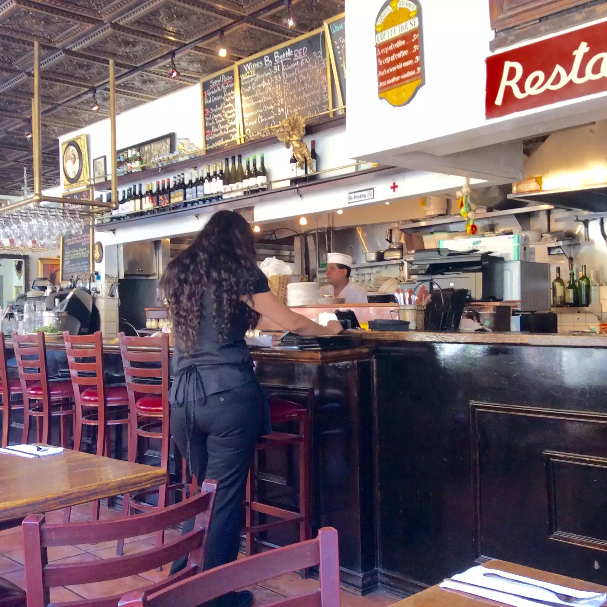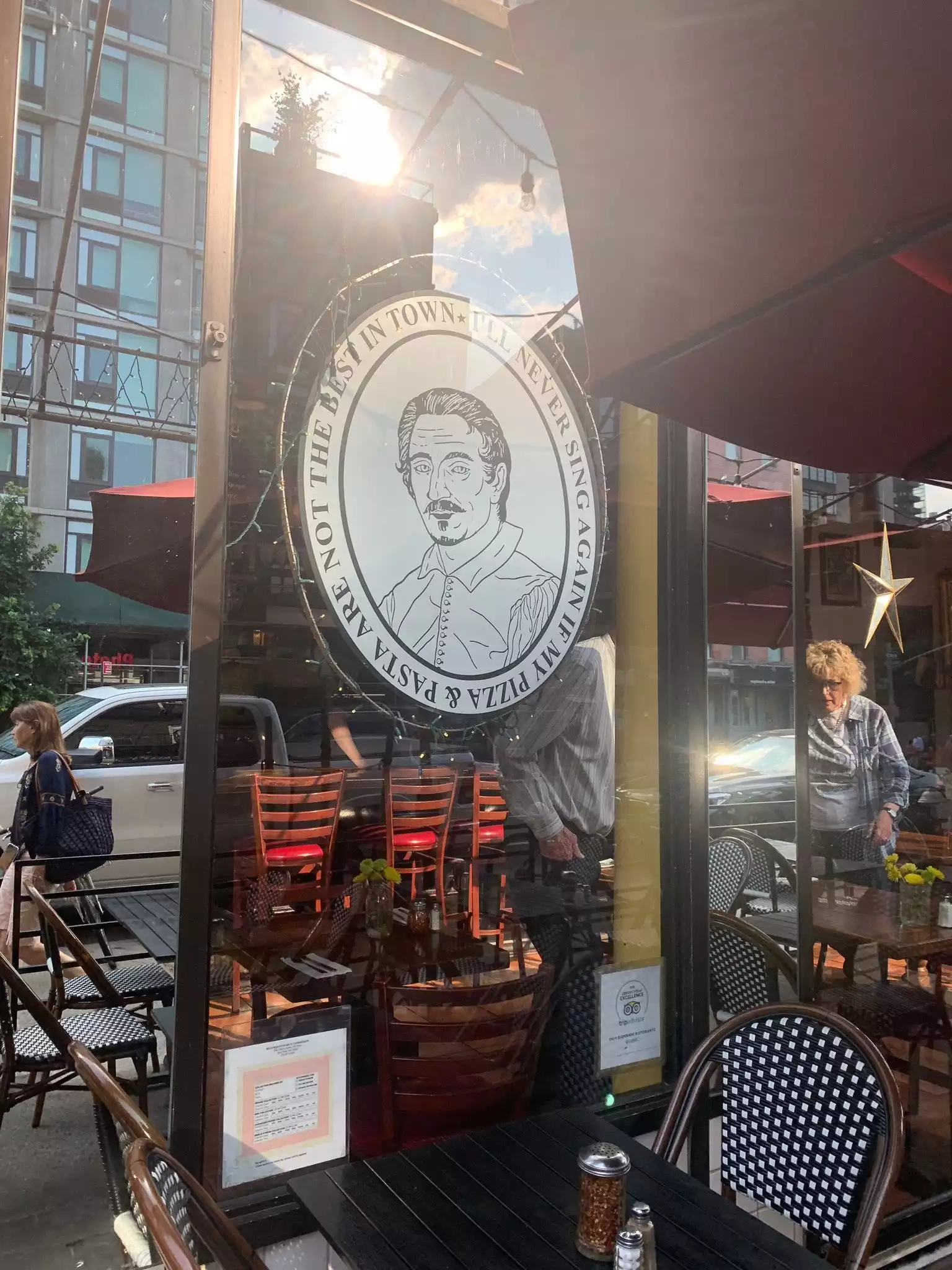 We found this restaurant in Chelsea walking around, the atmosphere is beautiful, with italian traditional (awful) music that at the end i must admit is relaxing... Prices are high, but we ate only a large pizza margherita (19 $) so we are in 2 adults and 1 child. Pizza was of medium quality but alright. Service was very kind. In.general a good evening.