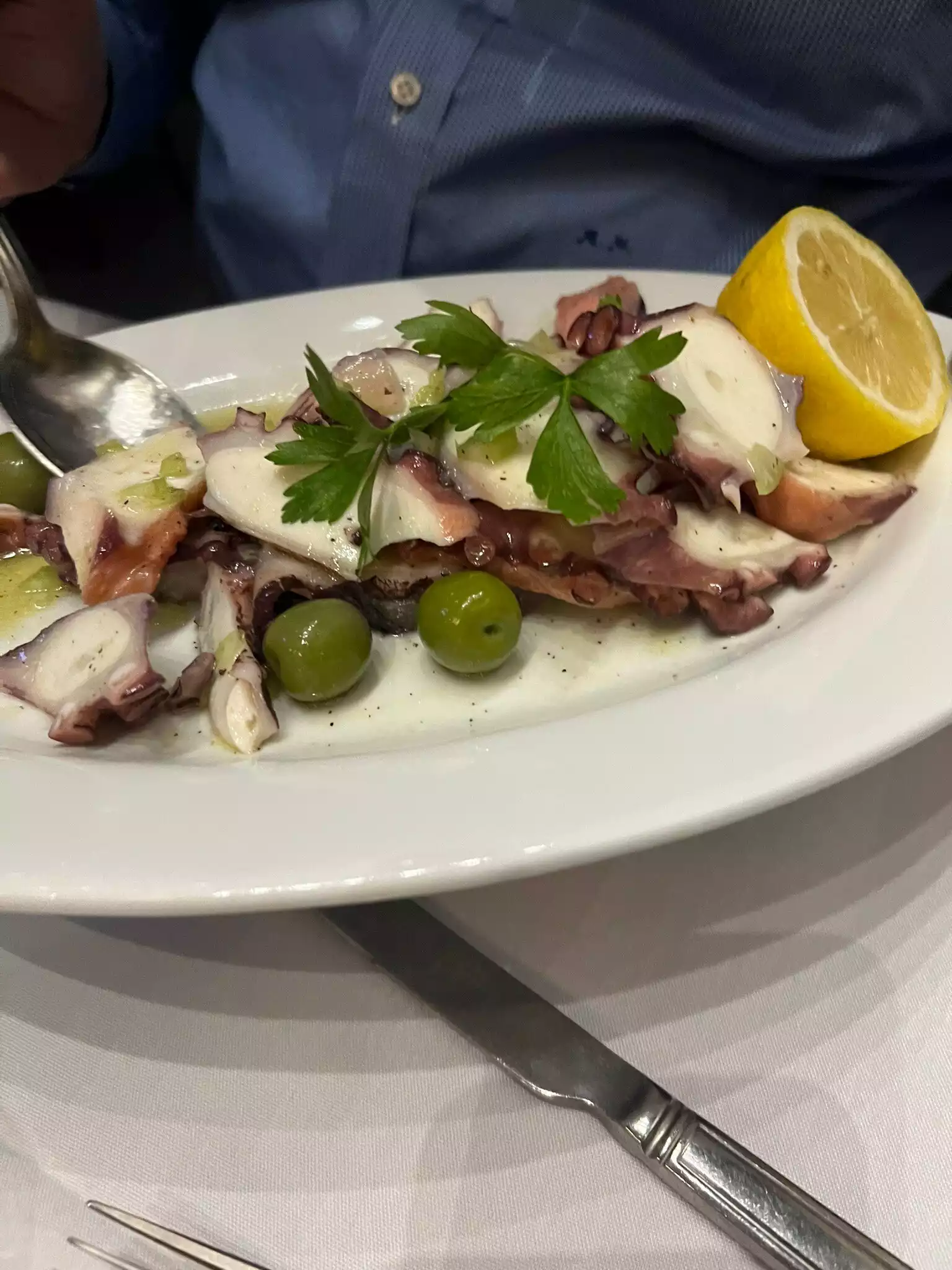 We had a great meal and experience Great waitstaff- and we were personally welcomed and engaged by the owner - Salvatore !! What a treat You can dine “Al fresco “ or inside at comfortable tables. We started with the funghi (mushroom) pizza - fresh , hot and thin on the bottom but ample edge crust. Great flavors (it had prosciutto) - yum ! The on to the fish stew - it had a full filet of fish on top, calamari, octopus, clams, fresh red base - delicious and clearly made fresh - I especially appreciate the lack of institutional over sodium red sauce fresh tomato take it to another level !! Then the pièce de resistance !! Salvatore made a ricotta and pear dessert “cake” (not a flour cake) that was light but delicious A real crown jewel to this awesome meal Home tasting cooked food with homemade dessert!! Heartily recommend !