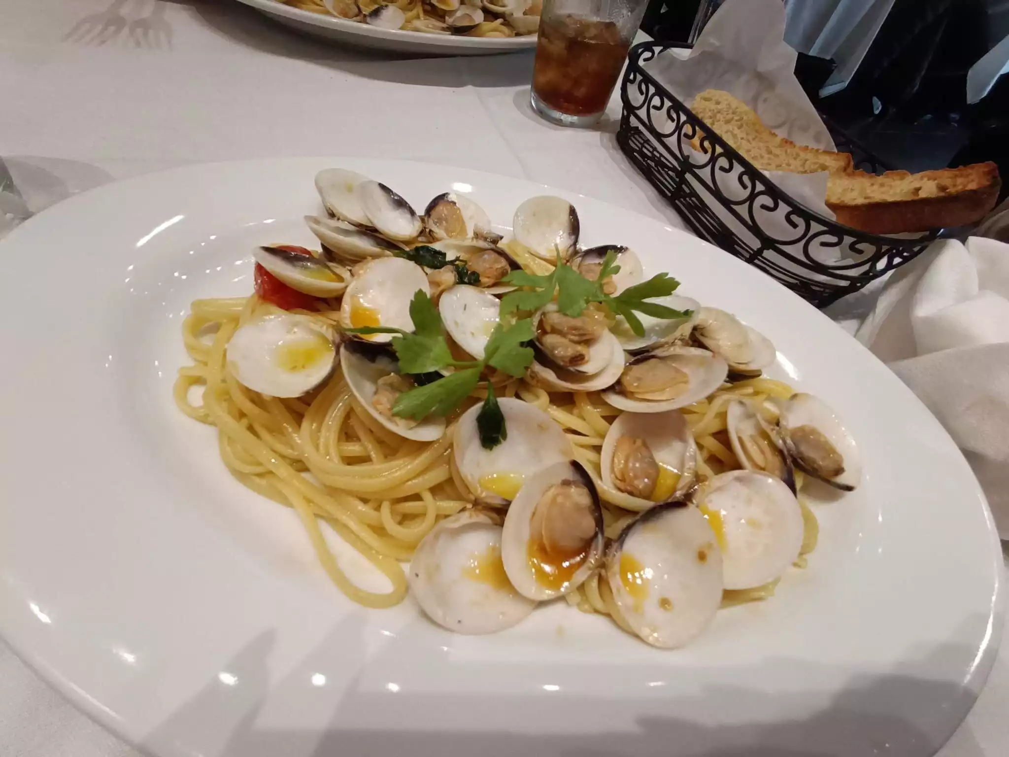 Have a nice dinner. Nothing that exciting. Good pizza, pasta mo. I took linguine with clams tasted only like wine and I found several times pieces of broken clams in the pasta.