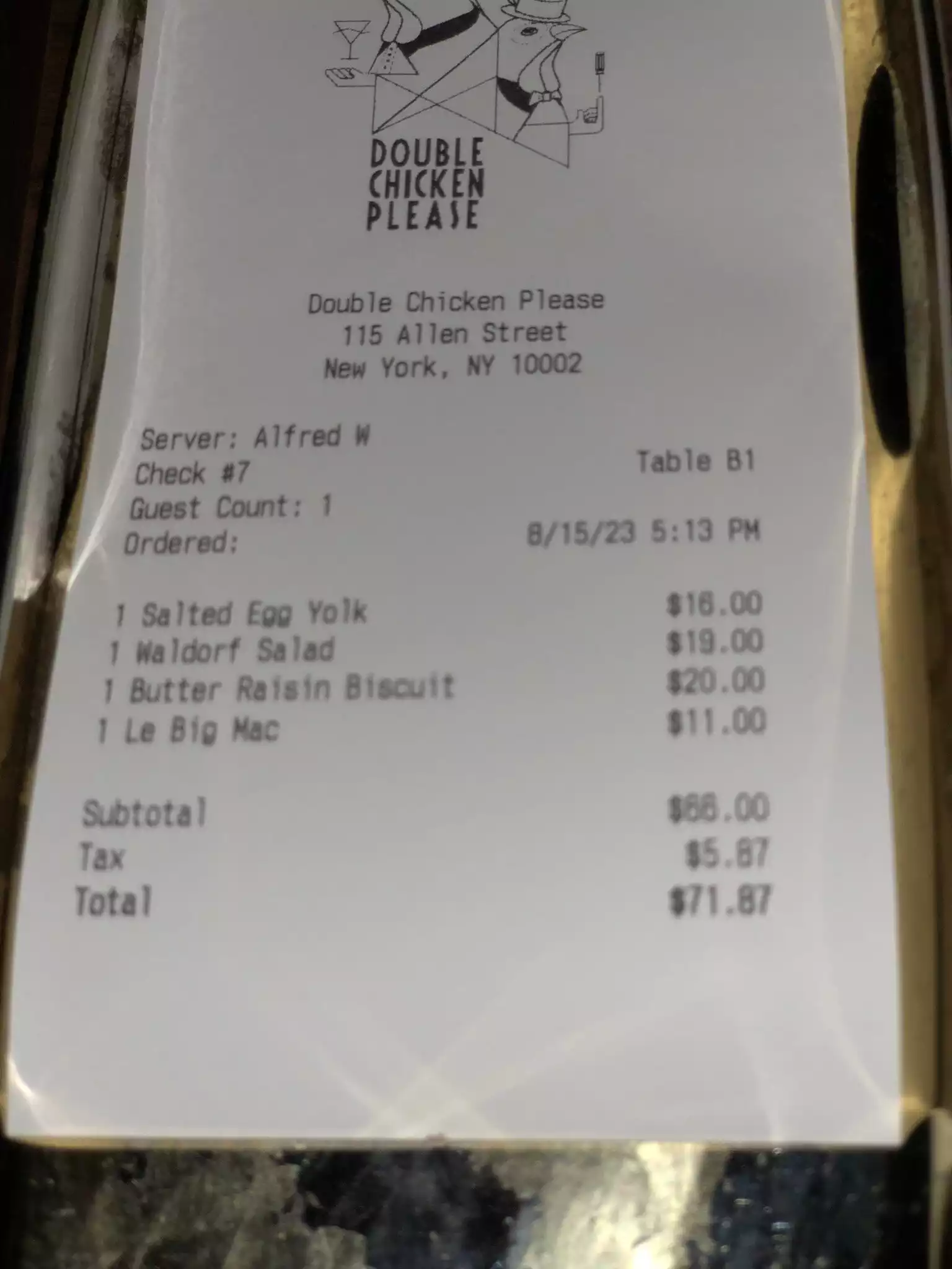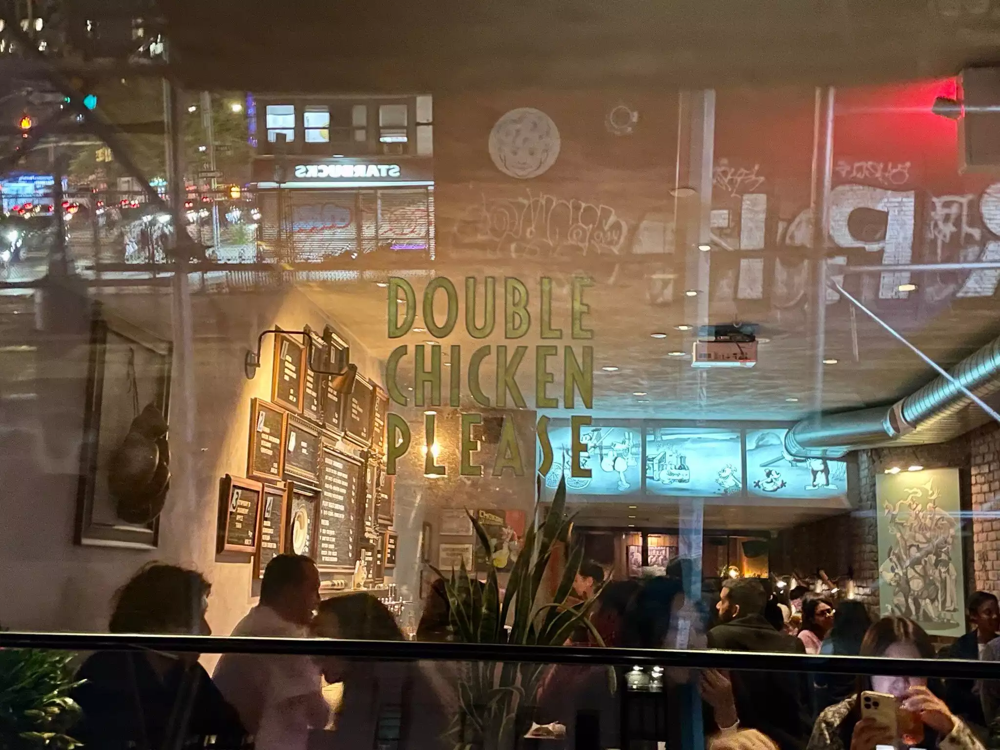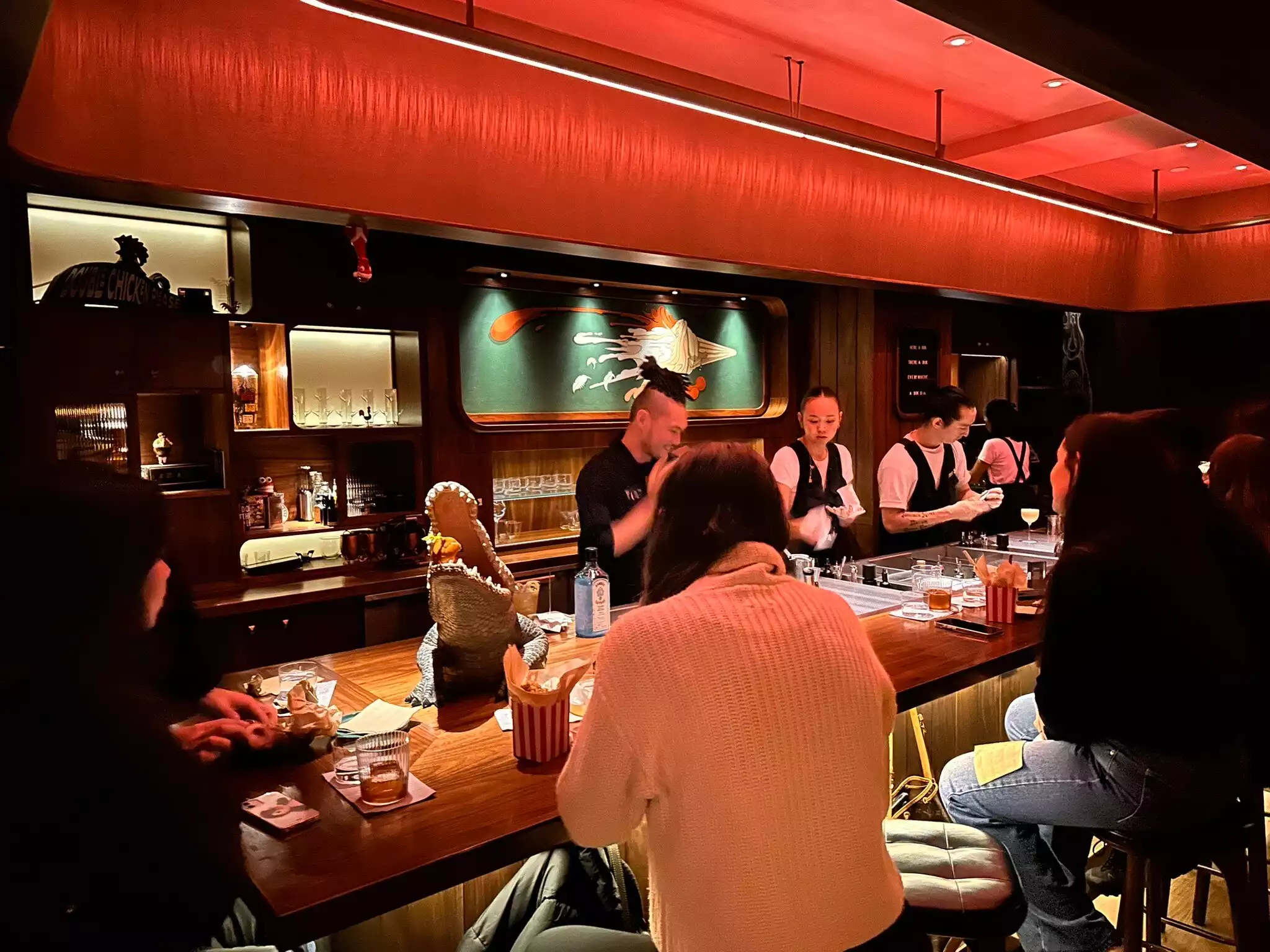 Stopped by Double Chicken Please on a weekend evening. The space has a trendy, speakeasy vibe and service was smooth. Cocktails were creative but tasted a bit flat — more fun in concept than in execution. The chicken sandwich, however, was delicious: crispy, flavorful, and well-balanced. Pricing was fair for New York standards. I’d recommend visiting once if you’re nearby, especially if you’re into food-focused bar menus.