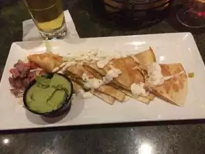 We had the 3 cheese chicken quesadilla and the bacon cheeseburger with fries, The bill including two coronas and a 20% tip was $50. The service from Ramiro who was working the bar and serving us food was excellent. We both commented about what a hard worker he was! An enjoyable experience!