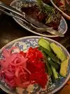 We visited on a small family trip to Chicago, the atmosphere is fun and cool and dark. The neighborhood is super busy so you mostly have to either walk in or get dropped off nearby. I was visiting with some family and friends and I'll be honest and say I'm not the most adventurous eater. I had looked at the menu before, and I didn't want to eat hearts or livers. I had resigned myself to eating GOAT since that's one of the main things on their menu. SIGH. I decided I could do that. So anyway I told my dining companions... maybe no hearts or livers? and we still found SO MUCH GOOD FOOD. Every single dish they brought to us was brilliant and delicous, even the goat. But the very very best thing, was the duck egg fried rice. You don't even know fried rice until you've had this. It's spoiled every single ever fried rice for me.
