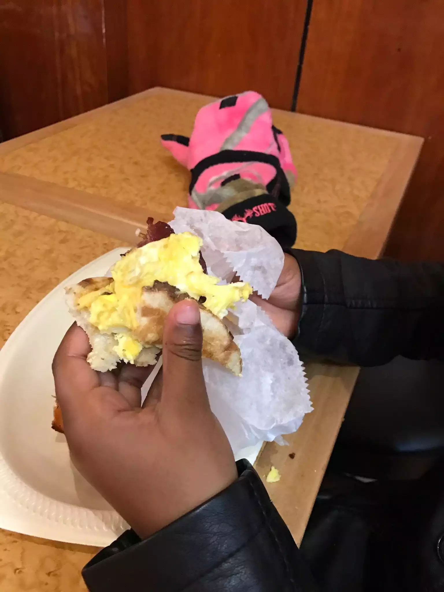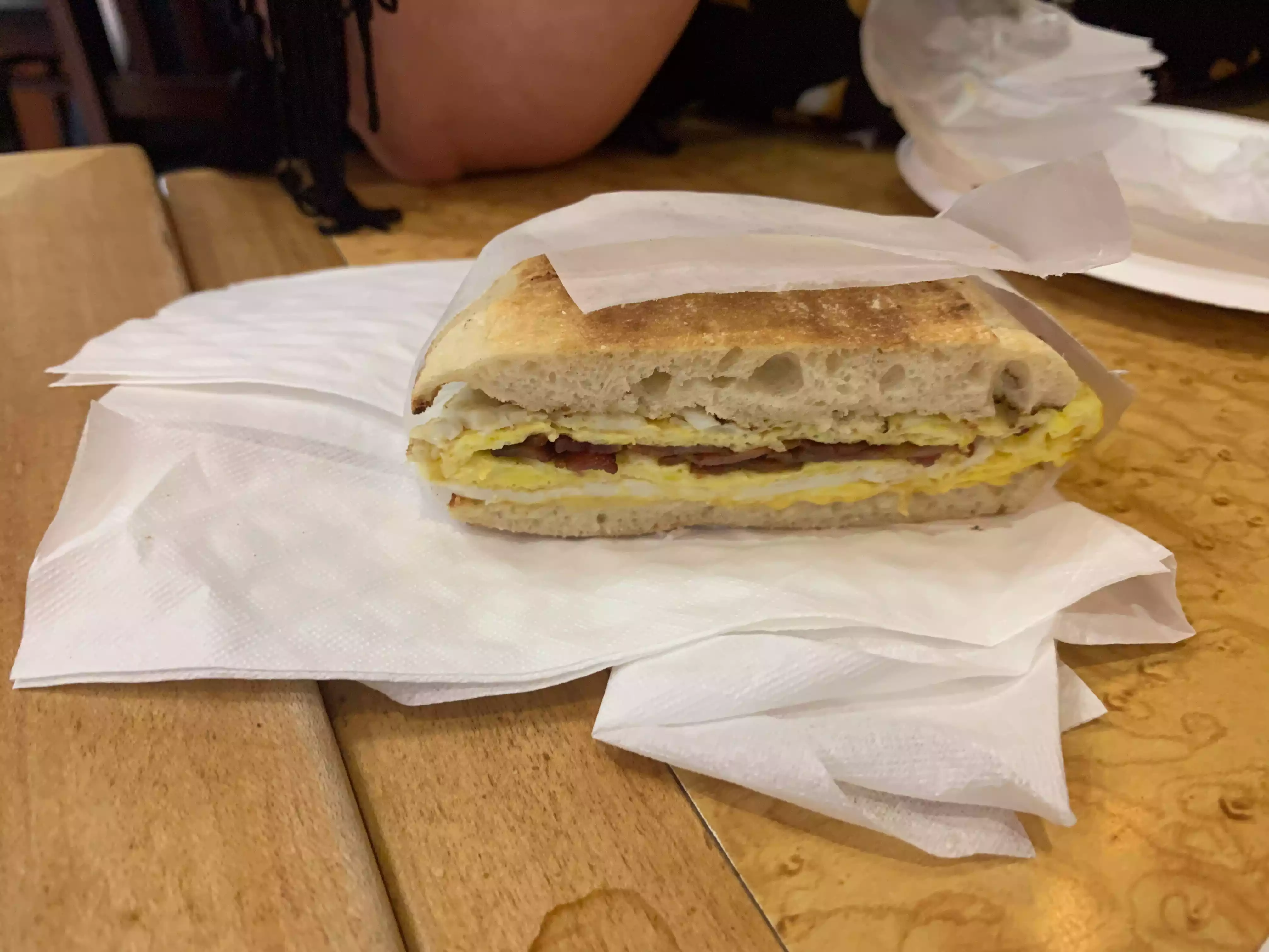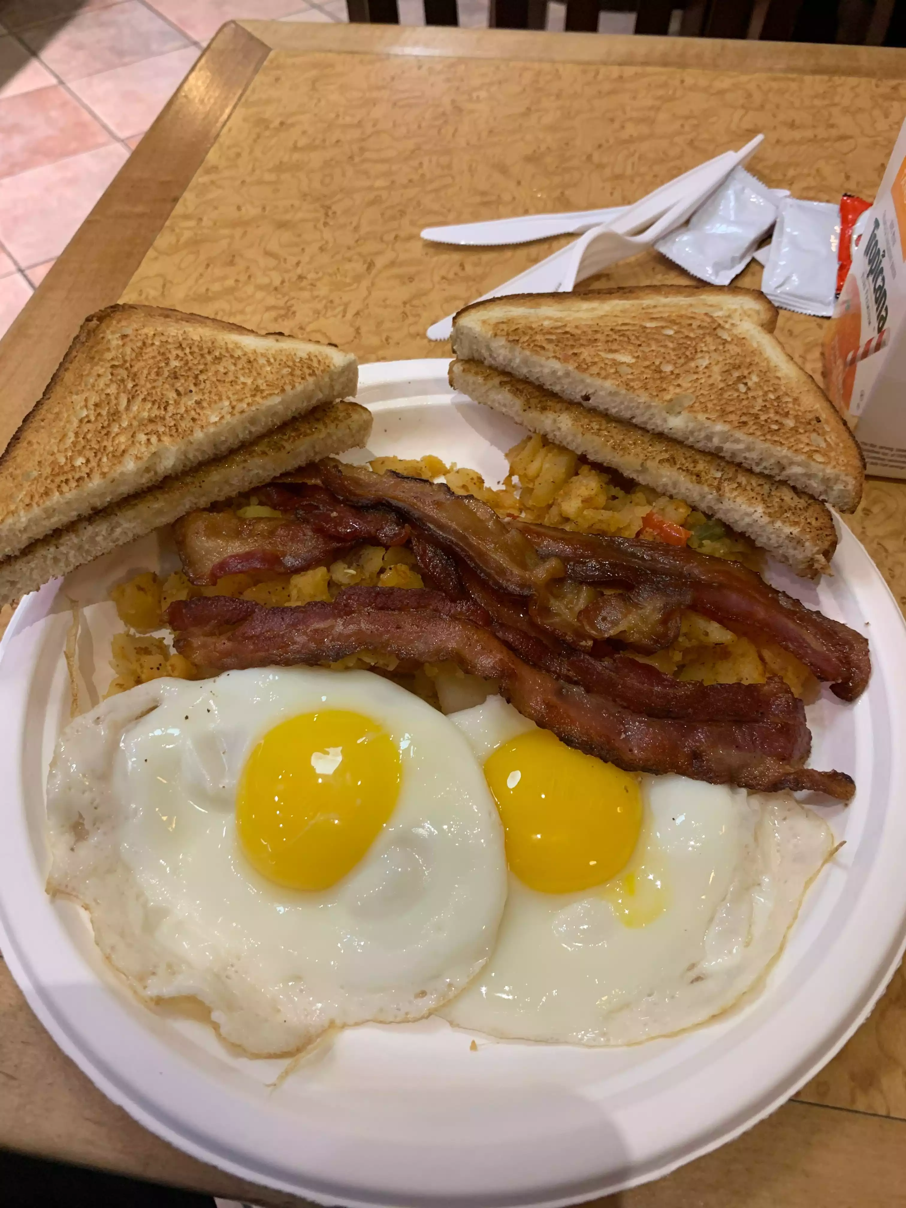 There is a line to order and you get to watch the employees cook your order while you watch and then move down the line to get coffee etc. What a great team they made, working together in very quick succession to prepare many, many orders. My husband had a breakfast sandwich while I had eggs (perfectly cooked over easy). The portions were huge. Seating is communal with plastic silverware.