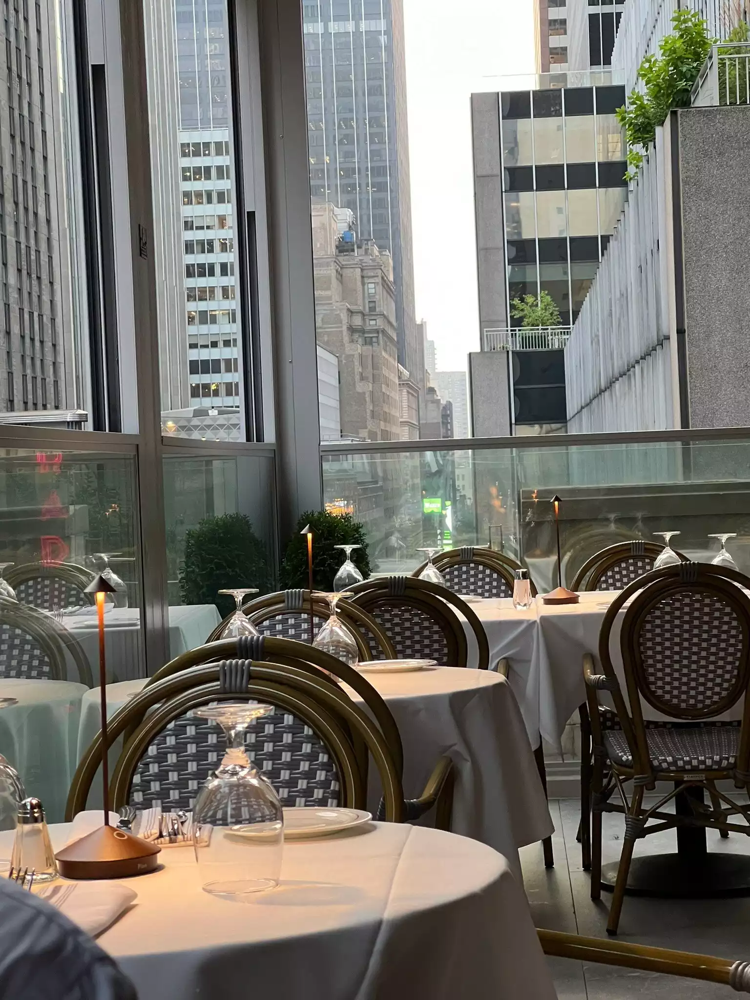 We were looking forward to a romantic dinner in Manhattan to celebrate our anniversary with a nice view of the holiday lights and St Patrick’s Cathedral on a Saturday night. The food, service and ambiance could have been nice but instead we were extremely disappointed. We asked for a special table by the windows with a view but got a wobbly round table by the door where every tourist had to go out on the rooftop to snap skyline photos in the 30 degree blustery weather. Needless to say it was cold and disruptive to our already lackluster food and awful service. We both ordered pasta and the presentation of the entrees were sloppier to us than how we serve our two Labradors dinner at home. The ravioli entrees for $30 each consisted of six ravioli with sauce in worn shallow plastic bowls with none of the repeatedly promised bread with our entrees. This meal was so disappointing we could not wait to leave. Recommend skipping this place. Try Limani nearby for a beautiful meal.