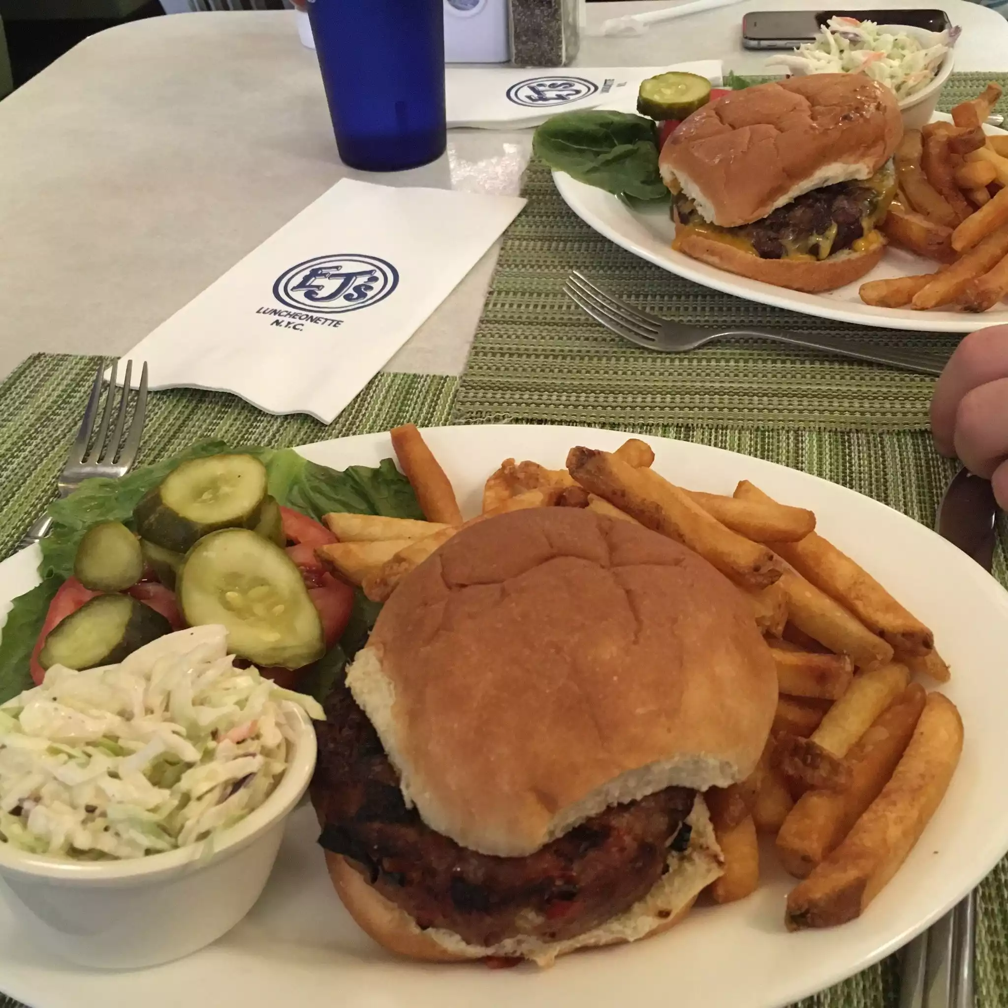 A group of four of us stumbled upon EJ's Luncheonette on Thanksgiving Day. We were in the mood for burgers and EJ's hit the spot. The burgers are big and juicy and there's an option of choosing grass-fed beef for $3 more. The sweet potato fries are delicious too. Despite it being Thanksgiving, the service was excellent at EJs. The server was attentive with our drinks and had a great attitude. We even spotted a minor celebrity and his family there. I would definitely visit EJs again.