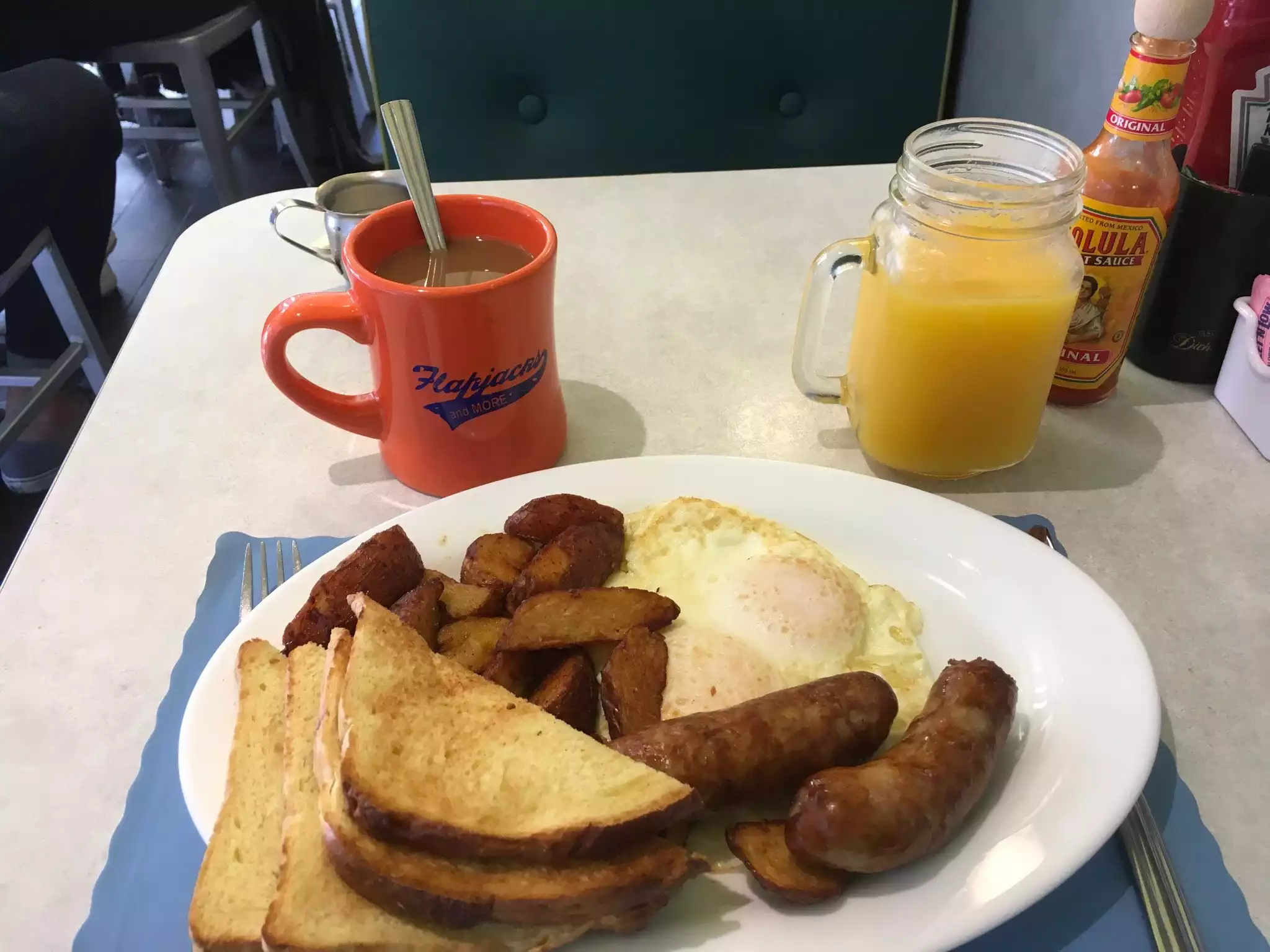 With 2 growing sons we needed an excellent breakfast to kick start the day. And we weren't disappointed. Excellent huge pancakes, waffles, sides of bacon, fruit on top. Or if eggs is your thing all options are available and the breakfast sampler was a great US equivalent of the Full English... Add to that free coffee refills and what's not to like. The diner was clean and staff friendly, service was prompt. All good.