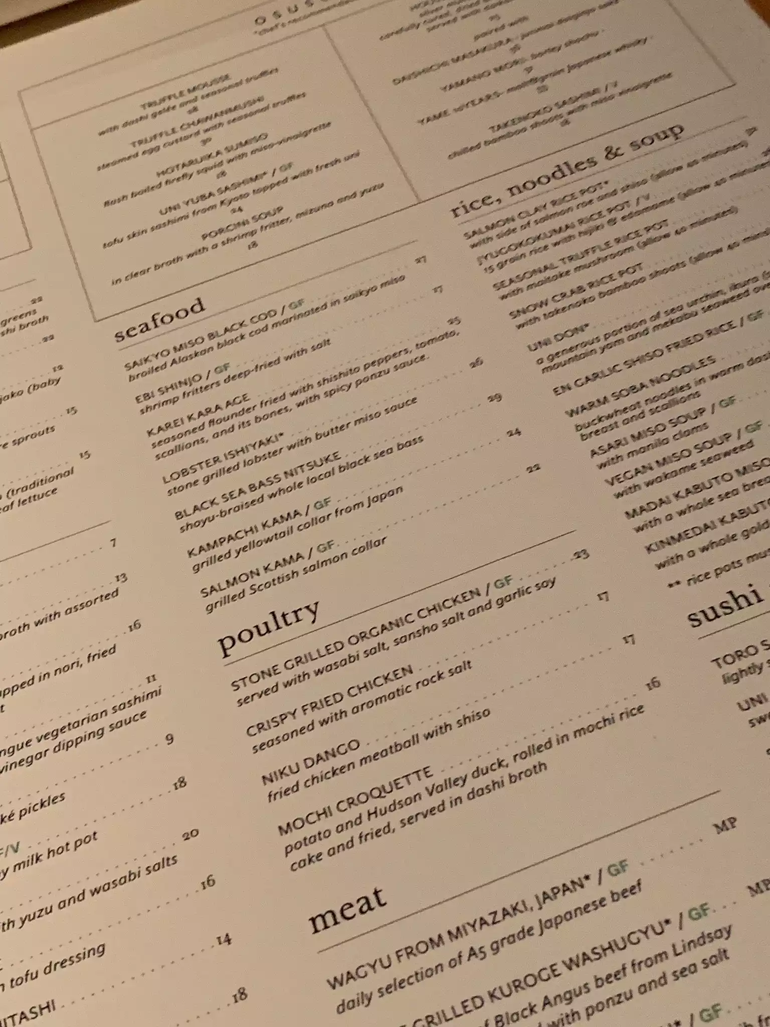 We had a reservation for 9 pm we were seated only at 10pm and that was treated as a very casual and common event. We ordered all the 7 Kyoto appetizers about half were really good and half mediocre. The miso black cod and the stone steak were very good. The whole sea bus was amazing, same the truffle dish.