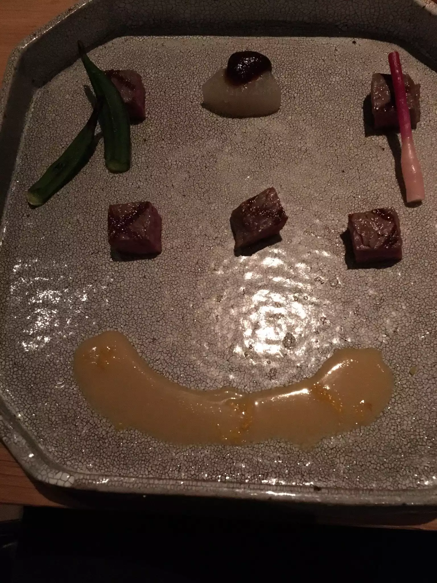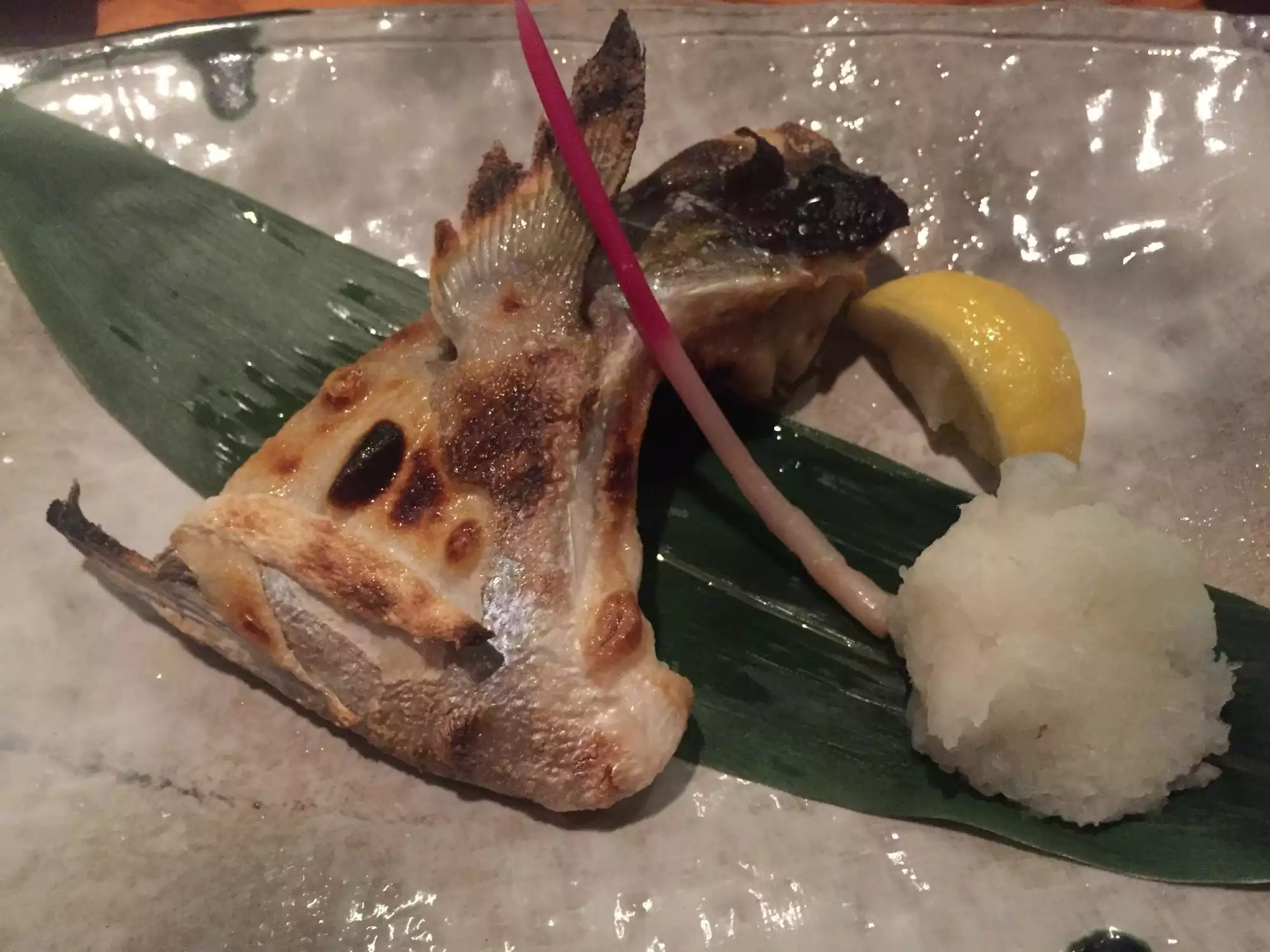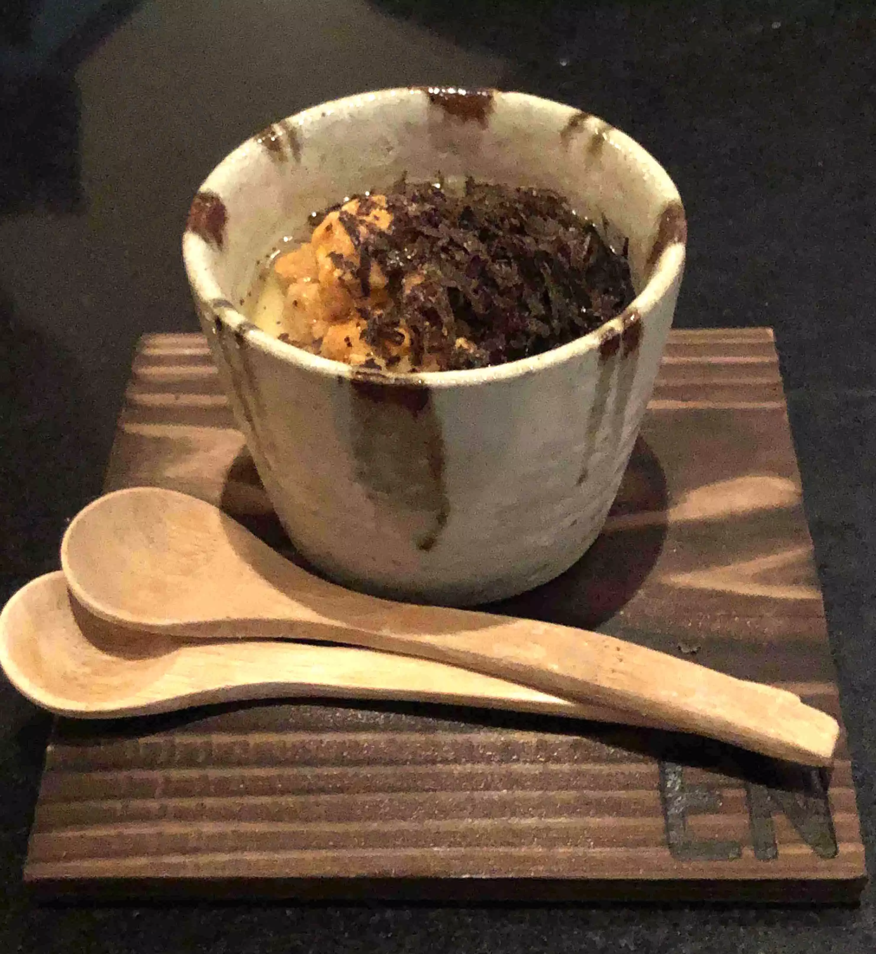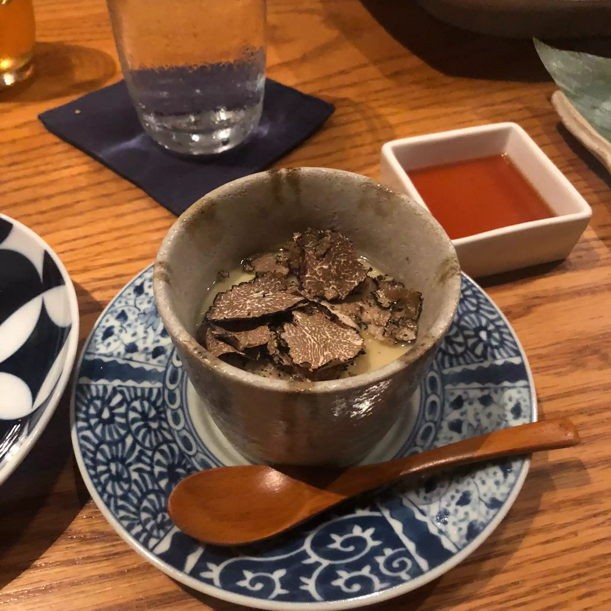 I wish I had taken more pictures as I was impressed with the layout of this sophisticated sexy restaurant housed in a previous furniture store. There were private rooms upstairs where one could be seated on a tatami mat. Downstairs was a bar area and 2 largish separate dining areas with a water feature. High ceilings, interesting woodwork and smart lighting added to the intrigue. There was, of course, an obligatory sushi bar. The presentation of the food was priceless down to the pottery, lacquerware, glass and wood. Many trips to Kappabashi in Tokyo must have been made for all the tableware used. The homemade tofu was unusually silky and the garlic fried rice was an unexpectedly tasty. The place works!