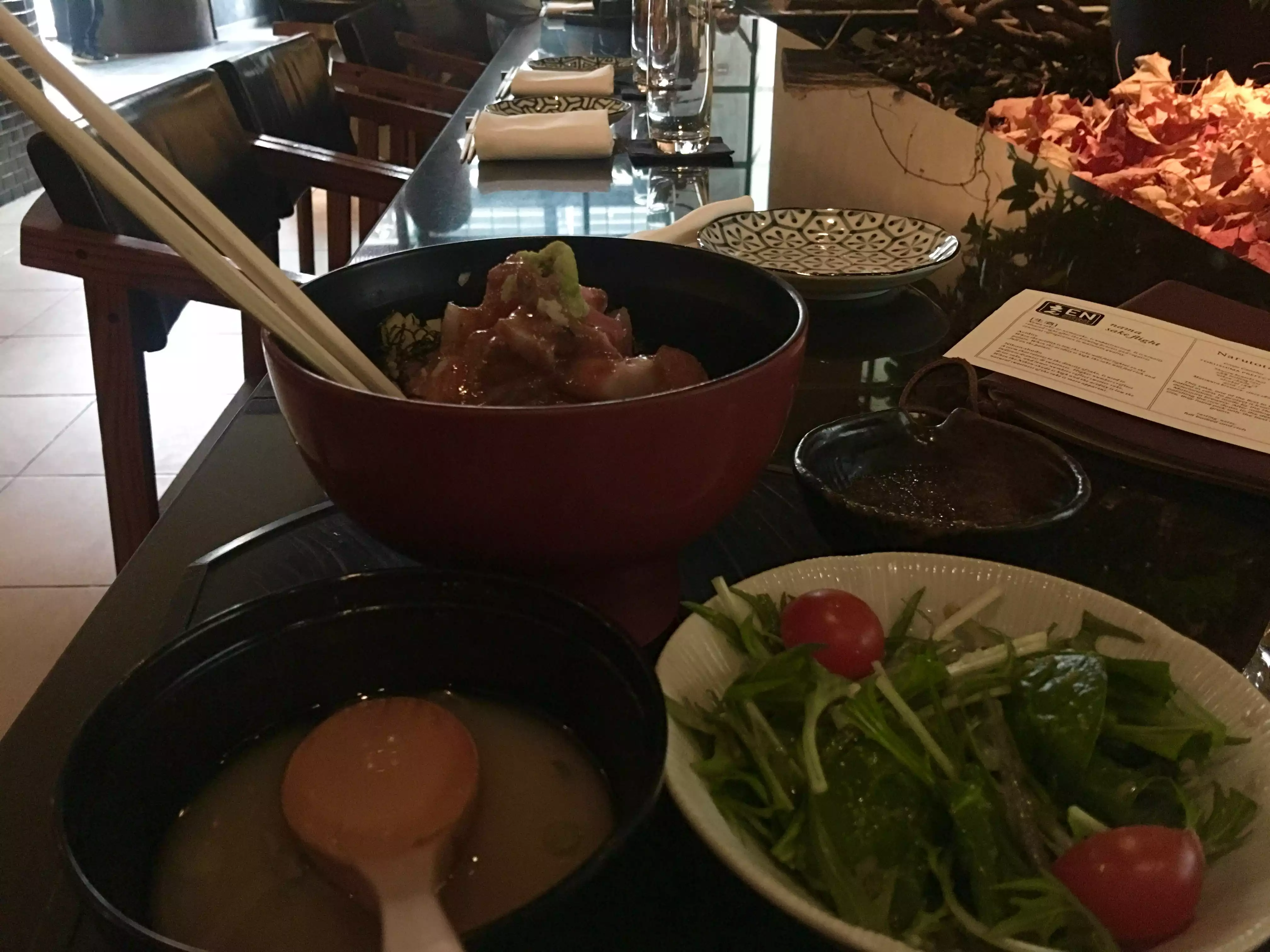 This caliber Japanese eatery does not come a dime a dozen here. A big dimly lit space with a variety of seating options. Cozy and intimate in spite of the size. Meticulously feng shuied I assume :-) The fish was first rate, both the sashimi and the kaisen don. The freshly-made scooped tofu is a far cry from the brick in the white tub at the store. Mild, silky and heavenly. The vegetable tempura was also a step above average. But was really marks a Japanese restaurant is the miso soup and the sauces. They were on par with some of the best I have had in Japan. The sake flights really elevates the dishes and is a must in my opinion.