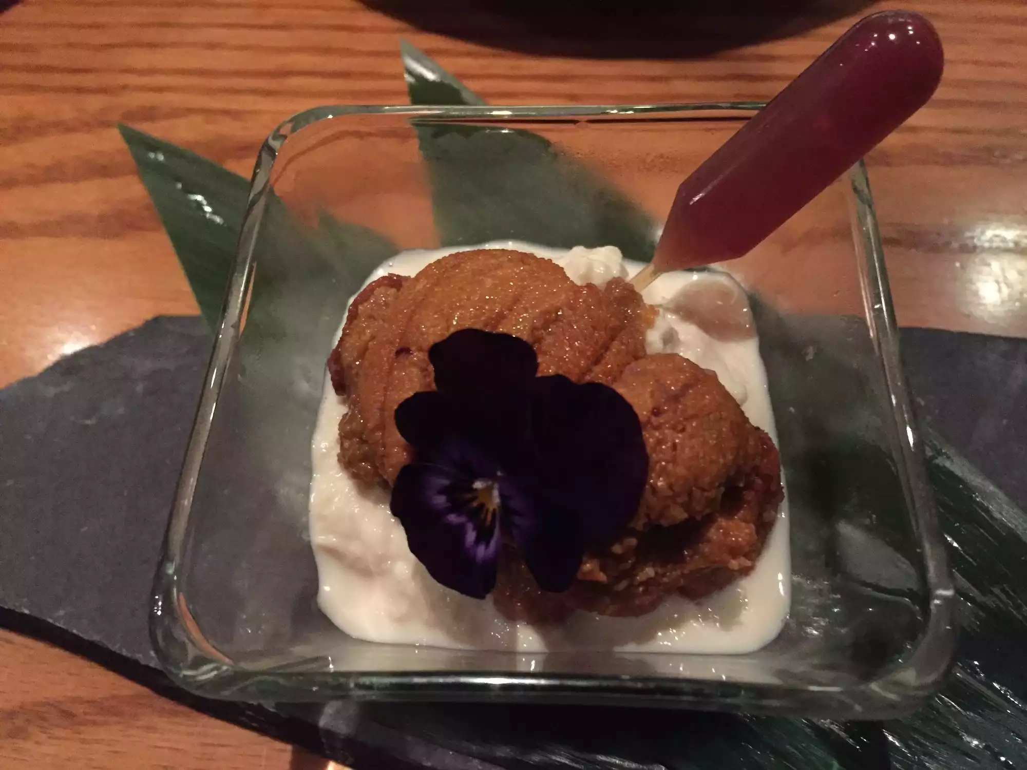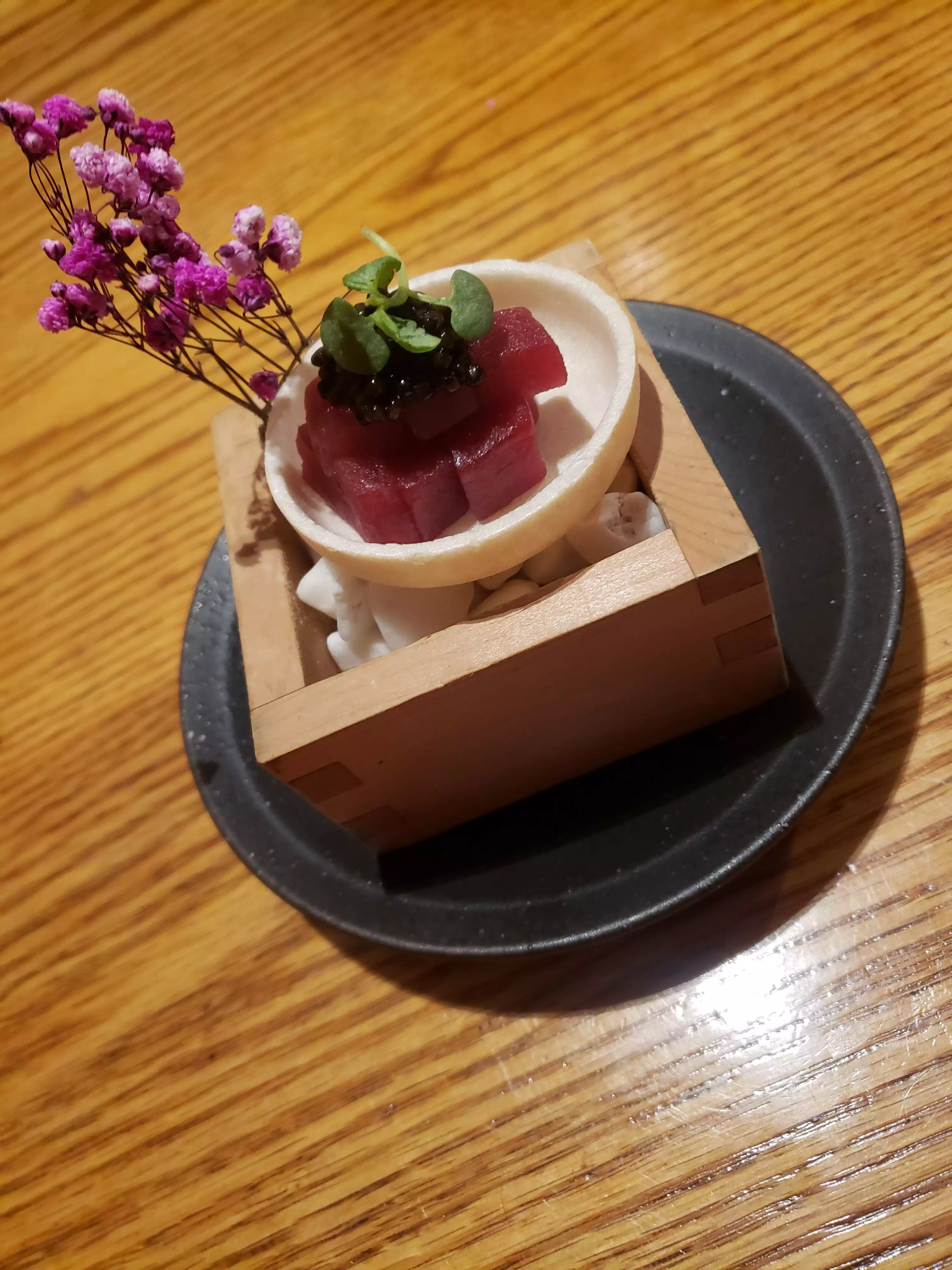 *3.5 stars* Came here for a date and overall had a great time and experience. Everything was so cutesy, creative, and unique, from the interior design to the dishes. The service was impeccable and friendly. Fried Oyster- 5/5 This was delicious! They cut it up 1 oyster into 4 pieces so it was easy to eat. Topping and sauce was delicious. Freshly Made Scooped Tofu ($11)-3.5/5 Fresh made tofu, definitely something I haven't tried, albeit I'm not a huge fan of tofu. They have an option of warm or cold, and we went with the warm one and added the wari-joyu and it tasted pretty good. I suggest adding more of this because it really enhances the flavor. Saikyo Miso Black Cod ($26)- 3.5/5 Two big portions of black cod, nicely cooked. However, it tasted just as good as any other Japanese restaurant I've been to. Mushroom and Crab Clay Pot ($40) 3.5/5 Comes out in a big clay pot, and rice is well seasoned with mushroom and snow crab. Overall quite tasty and portions are good enough for 2-3 people. Chu Toro Spicy okaka ($21)- 4.5/5 Yummy tuna sushi roll, although it seems and looks very basic. It had this crispyness to it, which was delicious. We ordered 2 rolls of this, and I still couldn't get enough. Raw Tuna & Avocado Salad ($22)- 3/5 The tuna to this had a quite strong fishy smell/taste to it, but it was bareable. En House Ice Cream ($10)- We got earl grey tea, fig, and fuji apple sorbet. The fuji apple sorbet was amazing, and the fig was unique.