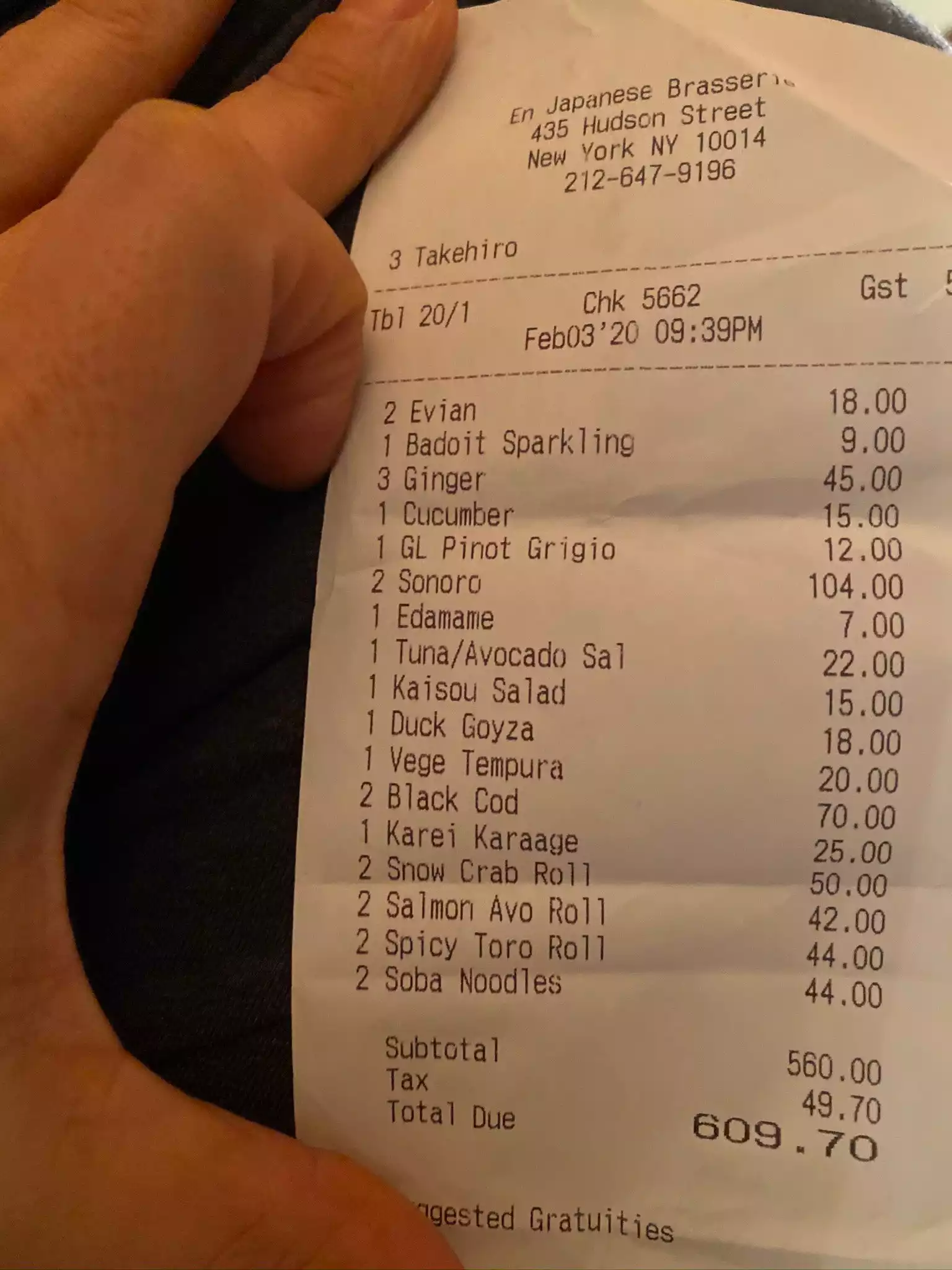 I had dinner with my wife. The qualities of Japanese meals were higher than expectation. Suchi was not outstanding and rather not good performance for its cost though (Maybe, rice parts were large and not so tasty). Anyway, EN in New York was different (in higher quality) than EN in Japan, normal Izakaya which Japanese are familiar with. On the other hand, the prices were actually high for Japanese who are used to eating nice Japanese cuisine. It is not easy to repeat visiting here for my budget as I can do for actual Izakaya in Japan… By the way, Japanese famous musician, Ryuichi Sakamoto, came in the restaurant when we were there. This restaurant can be a place where we can see Japanese celebrities?