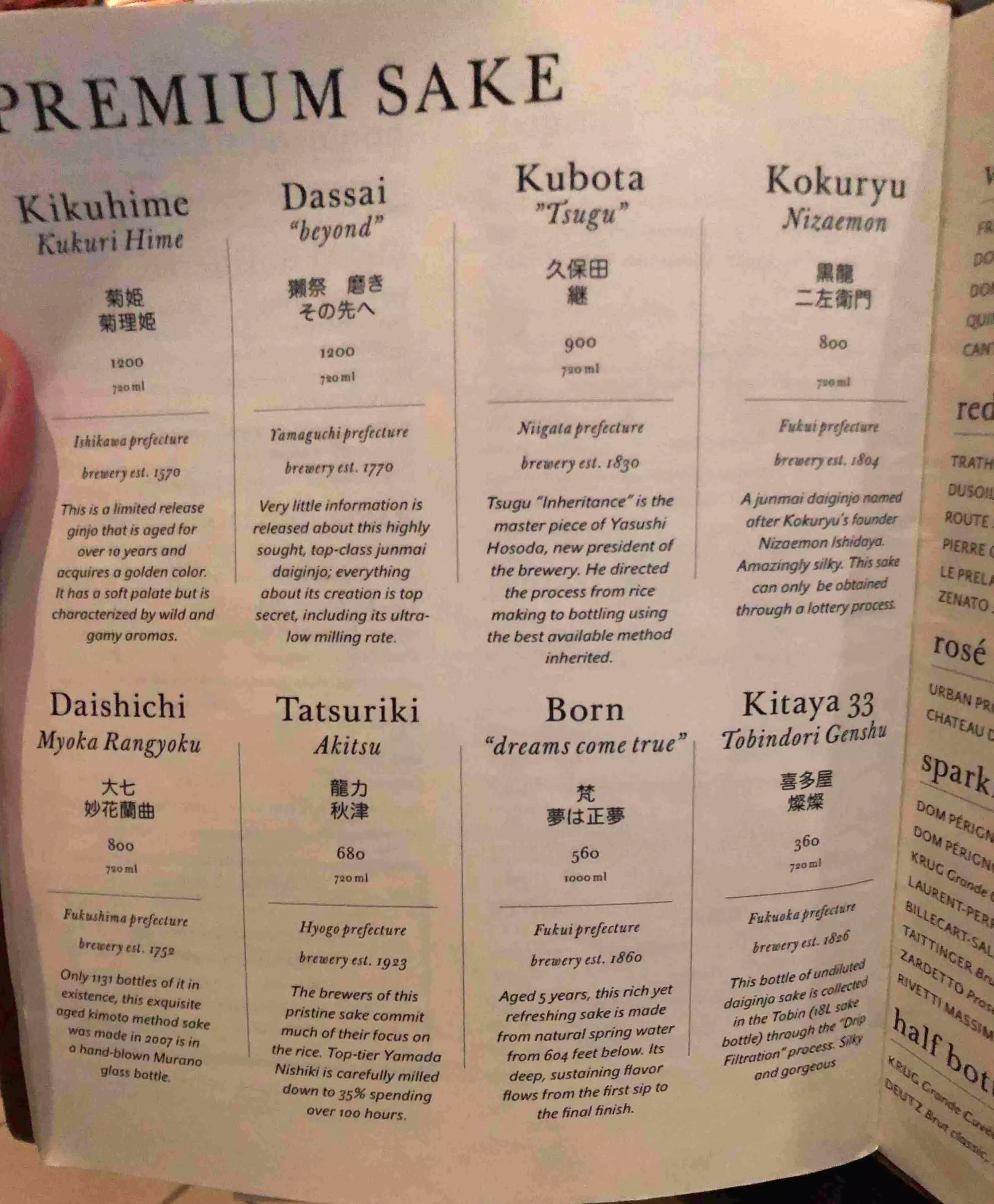 We had an 8pm open table reservation. We arrived in time but were told our reservation was for 8:30. I double checked my Open Table account and it was indeed 8 pm. We only had to wait until 8:15 so all was not lost. A glass of wine is a bit expensive $14. We sat at a counter top looking at the sushi chefs but the counter was high so we could only see their faces. We shared everything and each had two glasses of wine. We didn’t order any special tasting menus but we did have a trio of ice creams for dessert. Our bill was $185...a bit steep I thought but we had a gift certificate and were celebrating birthdays. In the end the service was very good and the food was very good and they told us what each item was if we didn’t know. I would go back but next time I know how much I’ll spend.
