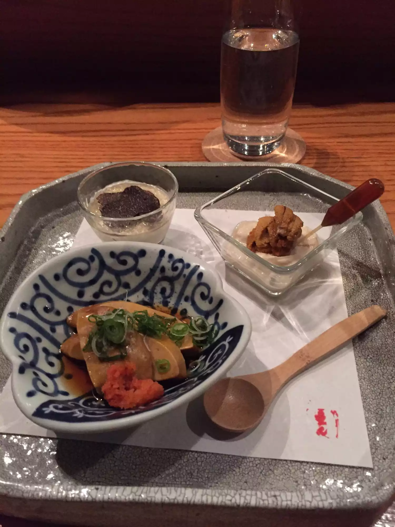 Ordered the same as everyone else, a set menu. Delicious but strange that every dish was explained to us in spite of having been given a personal menu of what we were getting. Sake with every course. Everything really good.