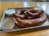 Very good bratwurst with home made beer cheese and very good potato salad. Pretzels taste like in Germany. This is extremely difficult to find in the US. The merguez wurst tasted like in France. A little bit hot and spicy made with lamb. All sausages are made here. Nice outdoor patio. Good service and great selection of beers