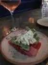 Started w delicious ABC pinot and other fun cocktails at the table. Had the tar tar , octopus and beets apps.. would say they are a little small for sharing w 4 hungry adults. But great flavors and interesting combos. We felt the menu leaned a bit Spanish w an iberico paella type dish which I enjoyed , Spanish octopus.there was some wagyu , pasta and short rib lettuce wrap meal at the table..all very tasty. Service was impeccable until dessert when we ordered and desserts and coffees never came.. bummer because really was flawless until that time..then it dragged..deserts came and coffee never did.. again I would say desserts on the small side for sharing. We tried creme brûlée and a blueberry crumble shortbread creation not on the menu but delish as someone in the group had read about it online. Cool Baths rooms, back hidden bar and lounge , cool atrium.. almost had a french brasserie feel… valet made life easy.. would love to go back..it’s over by one of our fave S Lamar haunts Uchi -YUM
