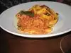 On a Sunday night the restaurant was peaceful. Our waiter was friendly and attentive, and the cooking was excellent. I had pappardelle with ragu, and it was the real thing: broad noodles cooked just right, a tangy ragu that was easy on the tongue. The menu was off-putting at first, this "fusion" stuff can be a trap, but our waiter was glad to answer questions and what he said was true. The are not strictly speaking an Italian restaurant, rather a sort-of-Italian restaurant, but once we got going it was well worth it.