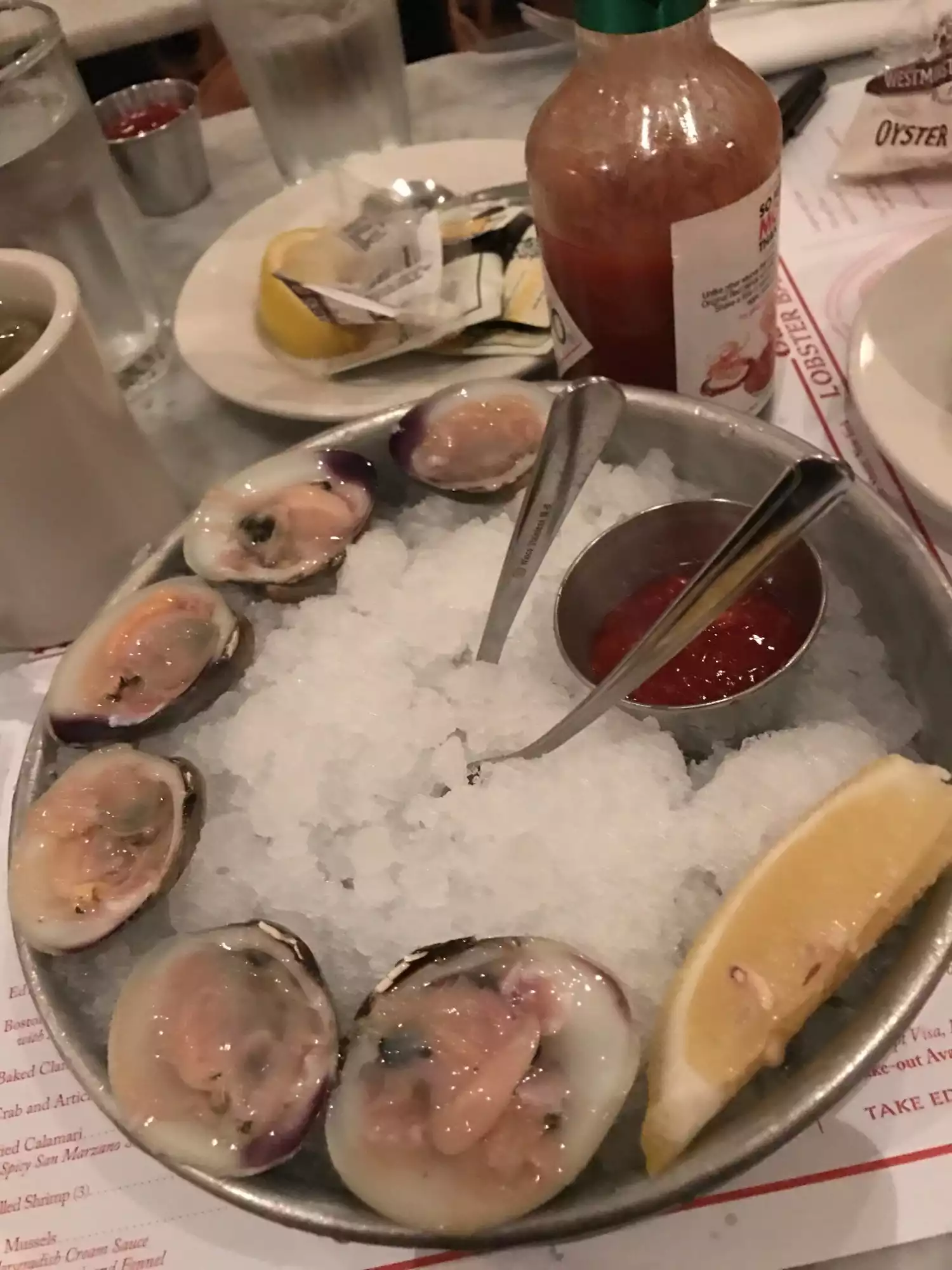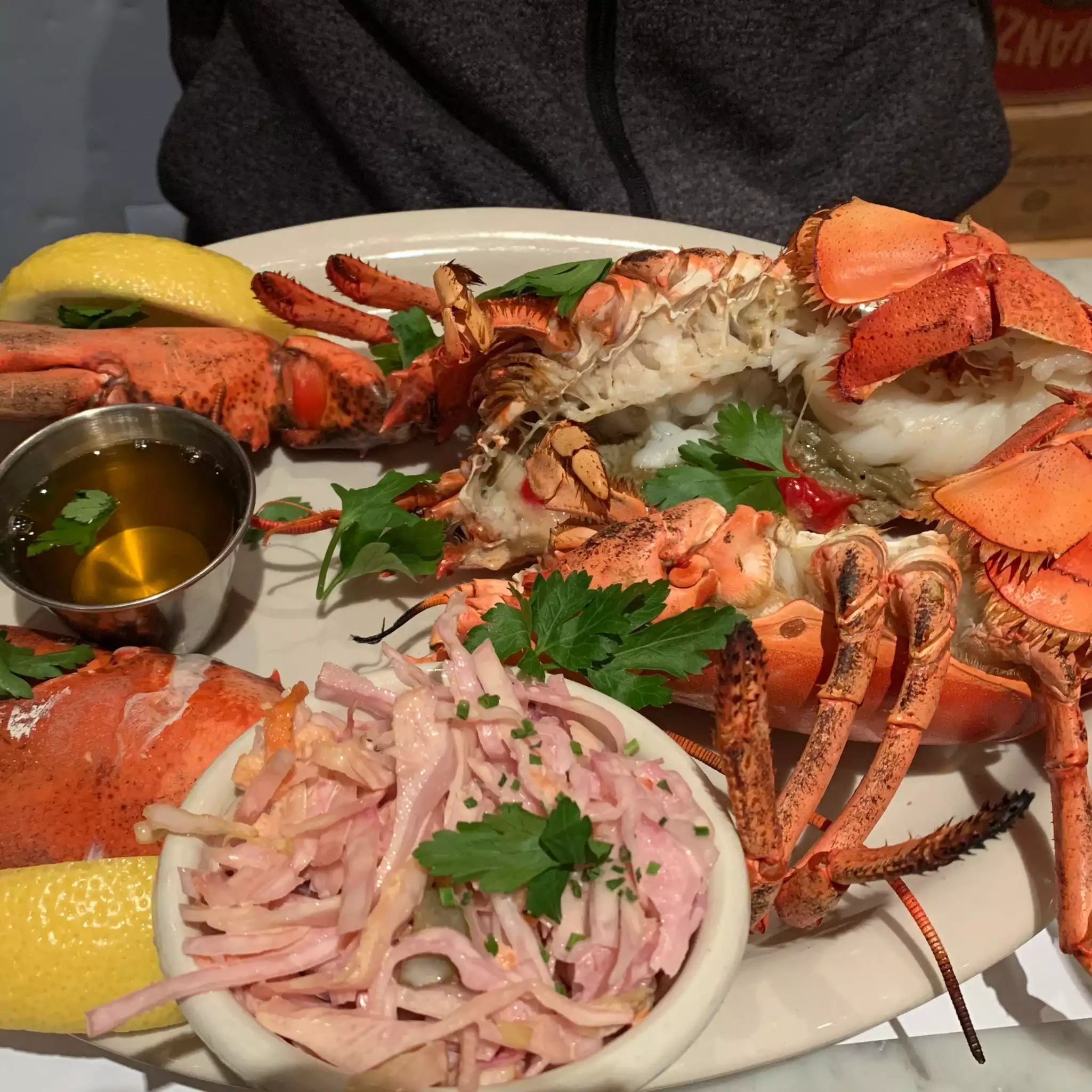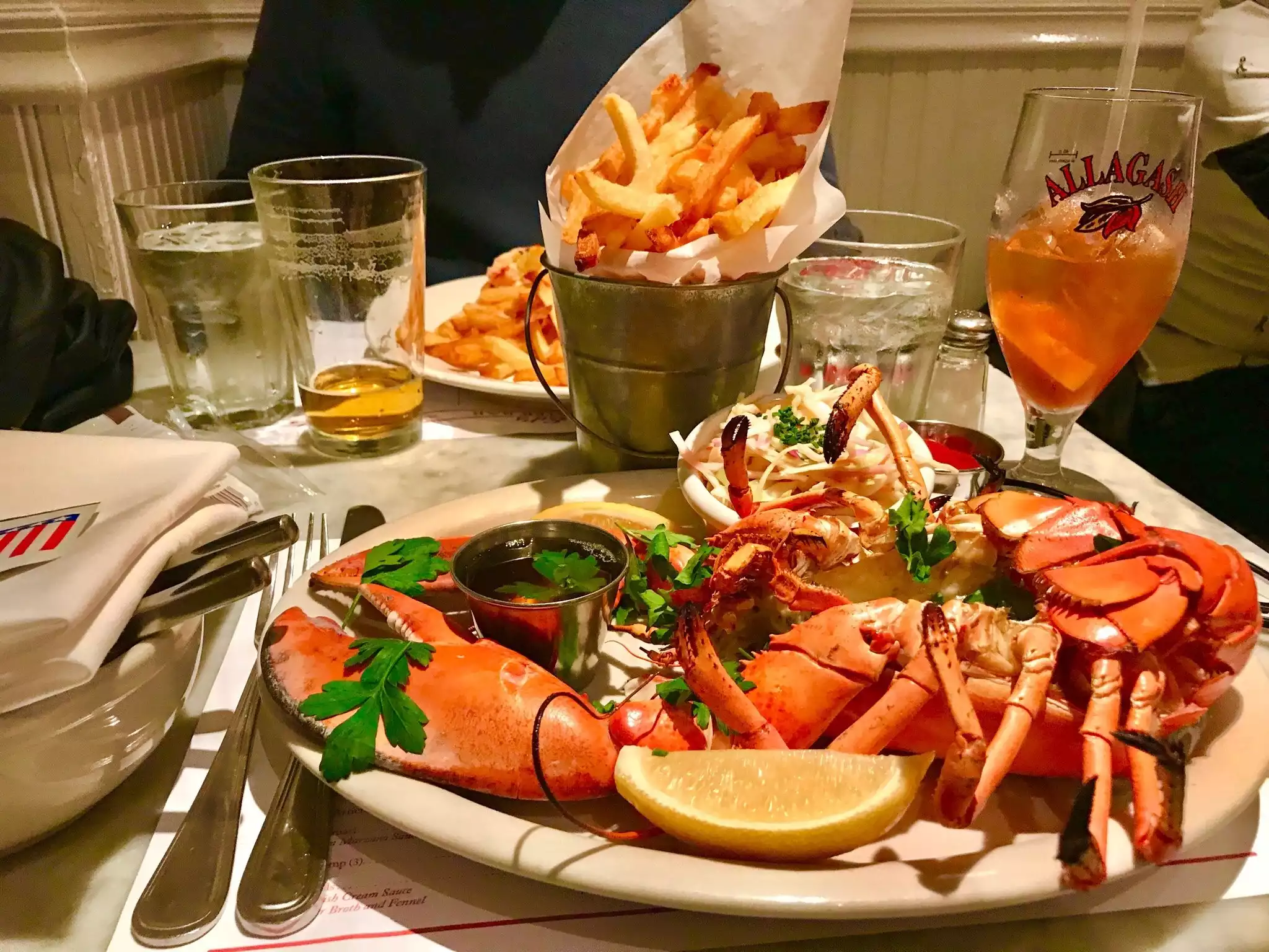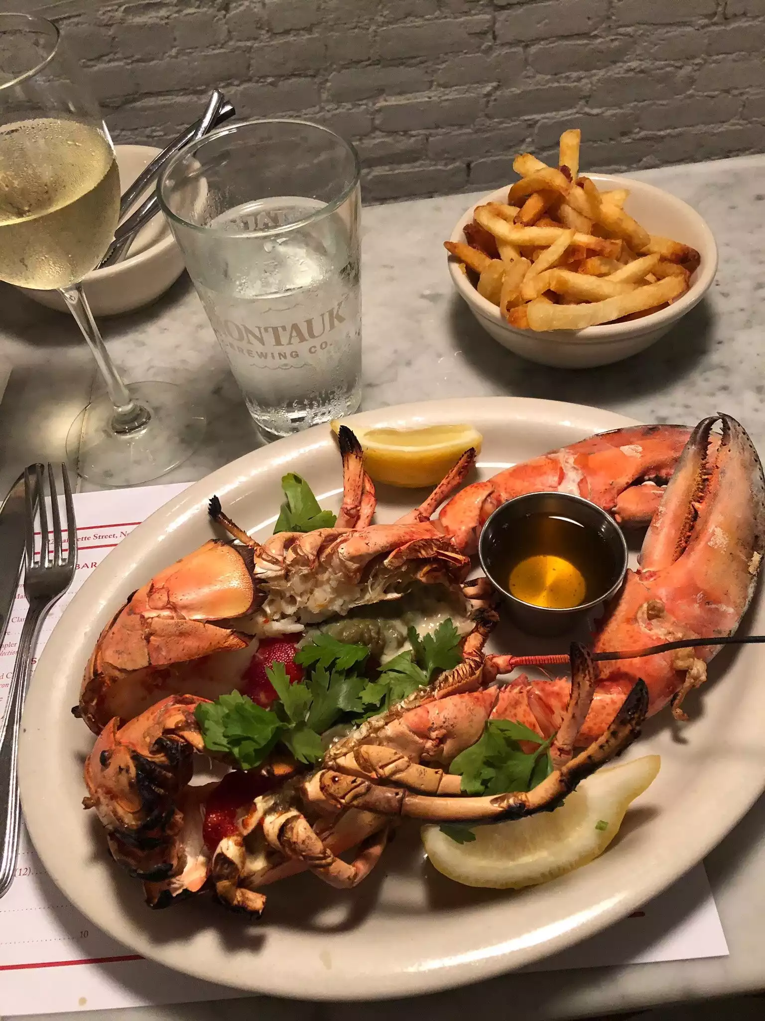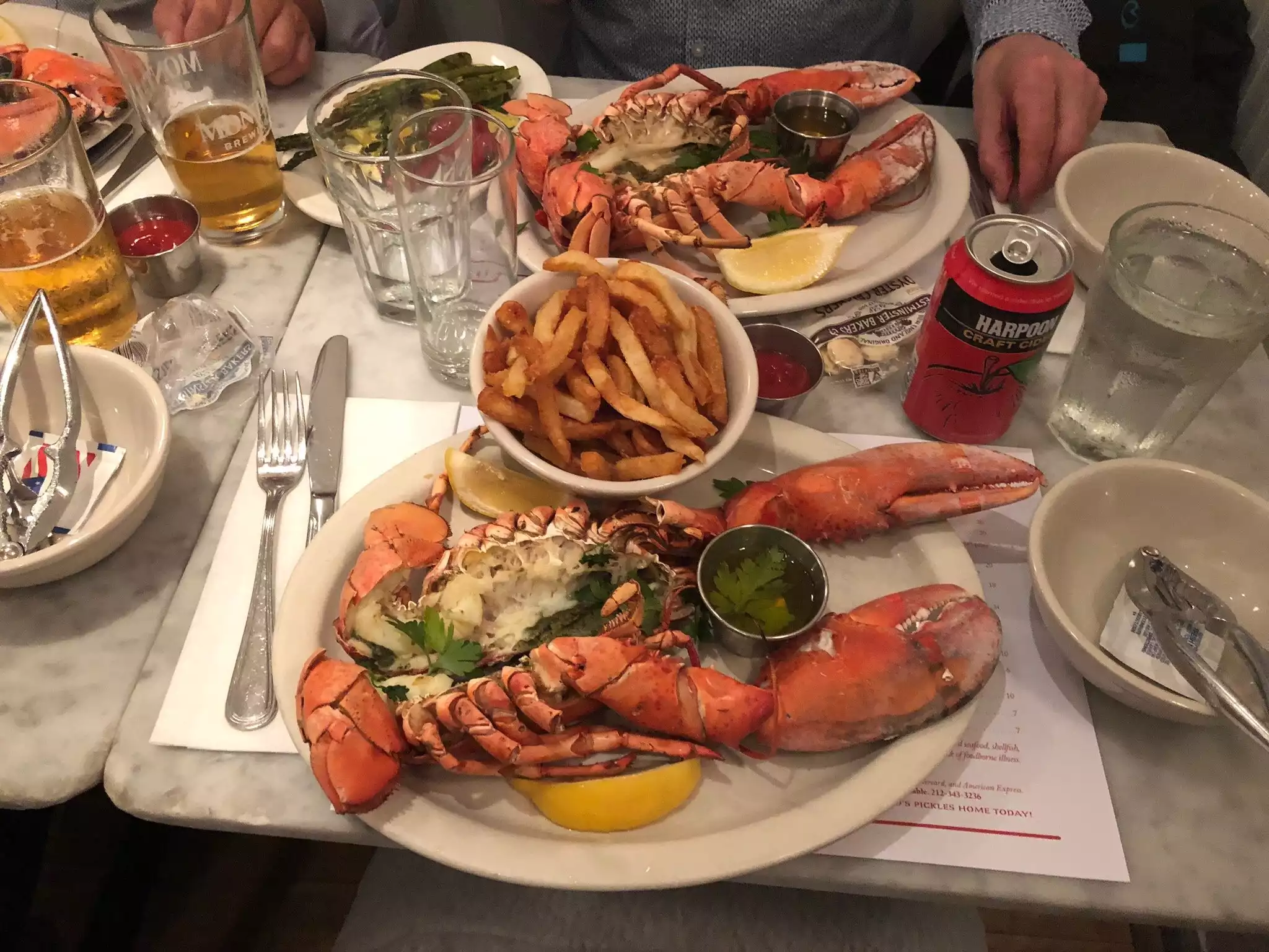 The steamed lobster was enormous and tasty. The iconic lobster roll was good but overpriced and really nothing special. Just a roll, a few pieces of lobster and fries for 34 usd. The chili marguerita was the winner of the evening.