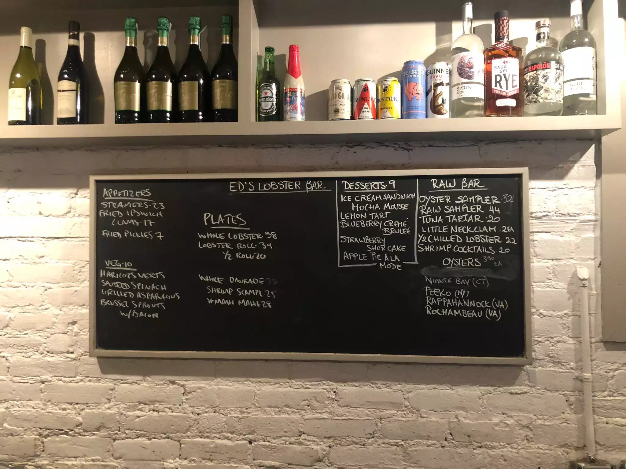 Ed's Lobster Bar is a long, narrow space with white brick walls and a huge chalkboard with specials behind the bar. It feels a bit cramped but is comfortable enough. Our high top table was in an area near the bar and our server was less than attentive, possibly because most of her tables were in another area. We got two glasses of water for three people and when we finished our cocktails she did not offer us more drinks, nor check on us after our meals were served. The lobster-centric menu is printed on the placemats and offers enough variety to please even non-lobster-lovers. The lobster roll was very good, served with fries and pickles. The lobster burger, also served with fries and pickles, was ok. I ordered skate because it is difficult to find. It was good, if somewhat dry, served with a melange of corn and cherry tomatoes. Grilled asparagus was perfectly cooked. If you are craving lobster in NY, Ed's Lobster Bar is not a bad choice.