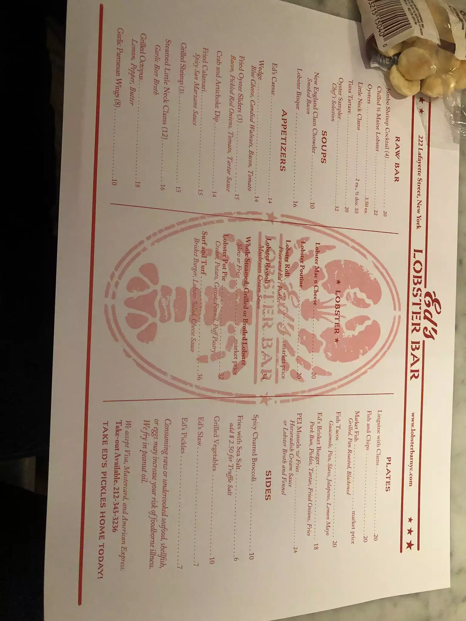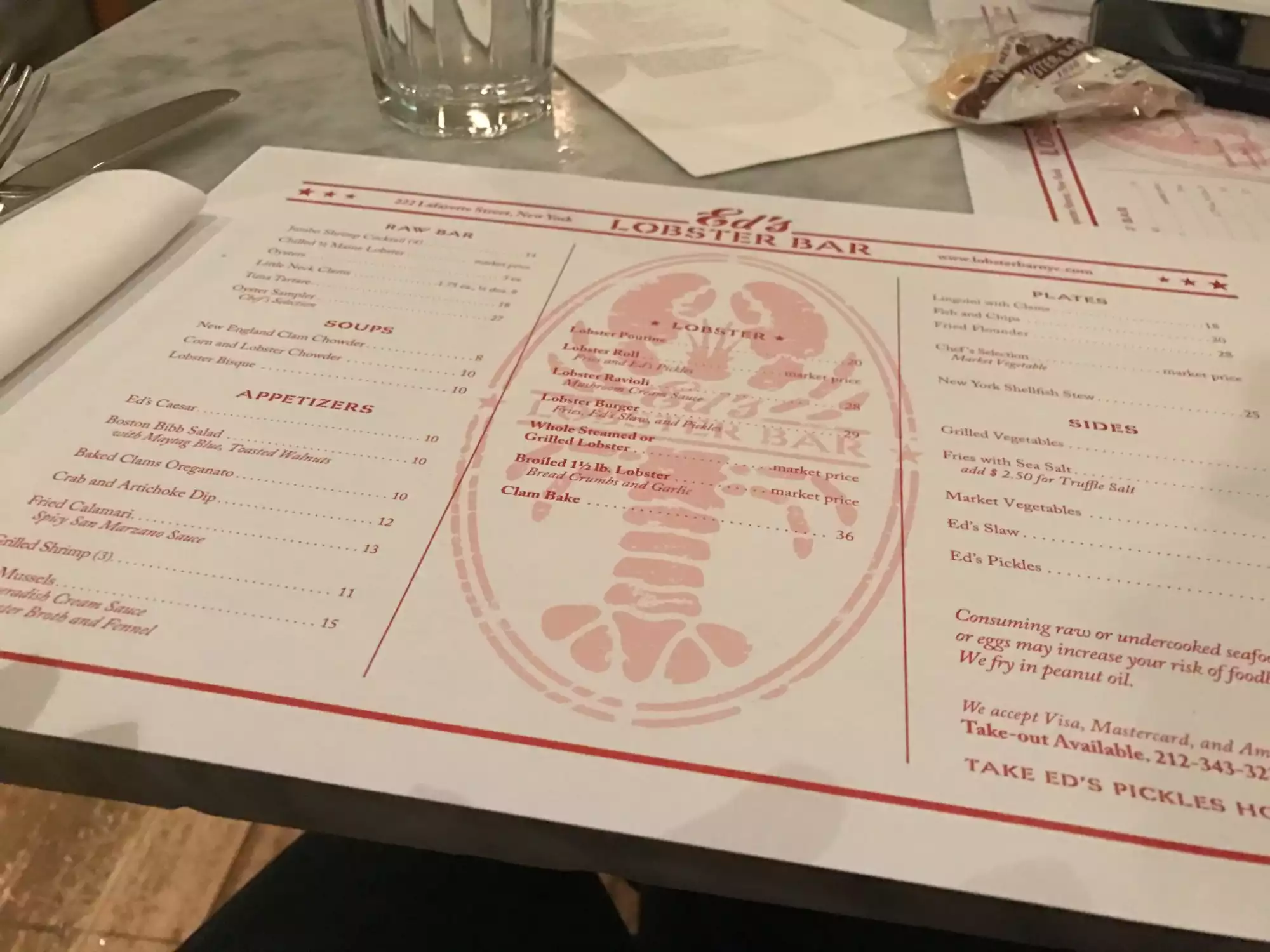My gf and had been furniture shopping hard in SoHo and visited Mitchell and Gold ( as an aside great pieces) after a decent sum of funds were transferred, we began looking for some lunch. Completely by accident we viewed Ed’s. Went in at noon on a Sunday. It was quiet to start but rapidly filled up. Lots of young people taking pictures of themselves with the menu? Anyway we met a great guy behind the bar who totally engaged us. The oysters carried a brisk briny taste, the condiments as well did not disappoint. Next, a sweet lobster roll with a small amount of mayonnaise and fat pieces of lobster. Ed’s homemade pickles came fried with a nice tartar sauce ( ranch would be good too). Made us feel like we were old regulars. I’ll come back soon!