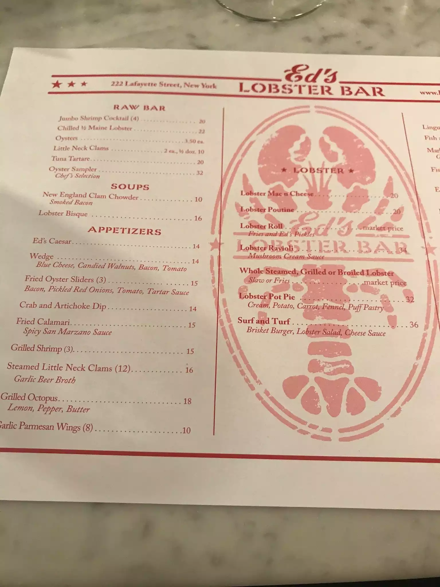 Ed's Lobster Bar is located 222 Lafayette St. Simple in the setting, the service was kind and very nice, and what food. We tried steamed lobster, bay scallops, artichoke and crab dip and clam chowder. All were delicious and prepared to the point. Great unpretentious address.