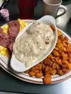 I got the biscuits and gravy with the side of potatoes. Plus I ordered two scrambled eggs. They have a seasoned potato’s but I opted for hash browns. Biscuits were good and gravy didn’t taste canned. The hash browns were really good too. My wife got blueberry pancakes ( two huge pancakes) and got full. My only regret was their water tastes funny.