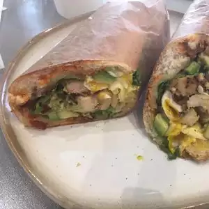Best breakfast sandwich I have literally ever had!! Breakfast banh mi made with housemade toasted sesame bagel, pork sausage, pickled veg, and spicy aioli with sriracha on the side. Rose latte was beautiful with rose petals and super yummy. I loved too that lots of different sorts of people were there-- visitors like me, folks working construction in the neighborhood, some corporate looking types. Great homey place with great food!