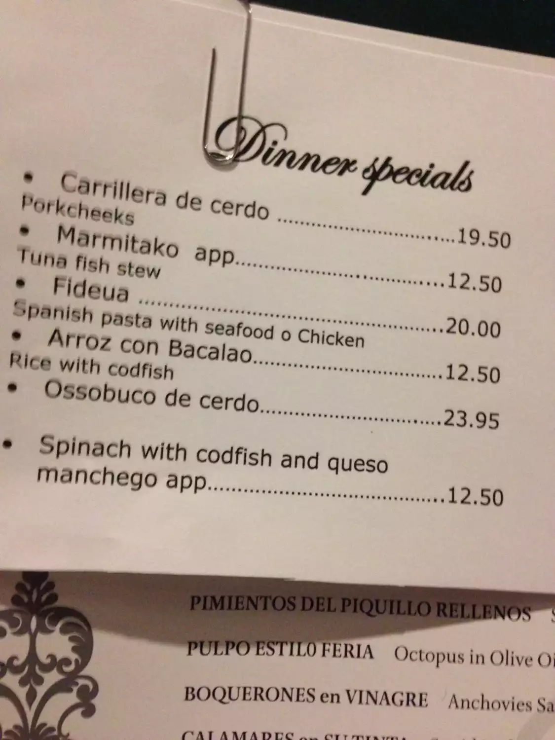 Had a very nice meal for 4 on a busy Friday night. Located A bit off the beaten path, but that was fine. Very small restaurant, bar and coat check out front. White tablecloths. Mature Waiters dressed nicely. Mixed , but more mature crowd. Enjoy drinking. Nice short ,reasonably priced short Spanish wine list. Can order by glass or bottle. Full bar too. Dinners come with salad. The bread is so so, plain white , Italian type , though heated , bread. Butter. Salads so so. Russian type dressing ! Throwback. No charge.... They offer 4-5 daily specials and fill Menu. Ordered black seafood rice dish( squid negro). Pork osso bucco , sautéed chicken breast. , mixed seafood in casserole. Served with seasoned rice. A Seafood soup. All were quite tasty, fresh and substantial too. Won’t go away hungry. Nice friendly and professional service. Reasonable prices too. Ordered a tiramisu and lemon tart for dessert . I dont think they make them. They have flan too. Deserts Not very tasty. Not worth the Calories . I would avoid them in future. Espresso and cappuccino just fine. All in all a nice traditional ( bit of old school too!) ( American) Spanish style meal. Just what the doctor expected and ordered.