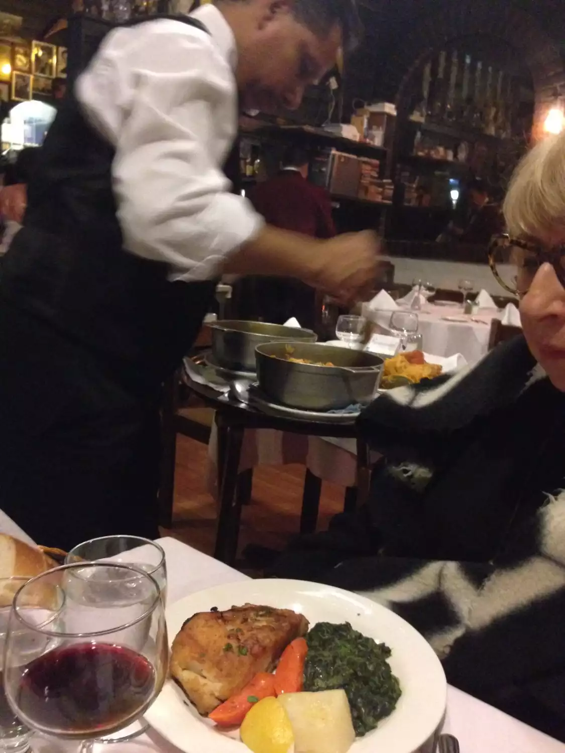 Visiting friends in Midtown East Manhattan we all went to their favorite neighborhood restaurant. The restaurant has a warm, old fashioned, charming atmosphere. The wait staff is professional and friendly without being at all overbearing. Two of us split the delicious Paella Valencia. It was very much enough for the two of us. Our other friend got Chicken Cordon-blue (not a typical Spanish dish but he said it was wonderful) Entrees all come with a nice salad. For desert we got a tartuffo, again not typical, but excellent. Give the portion sizes, the nice atmosphere and the excellent service, this proved to be a very reasonable priced restaurant. I definitely will return.