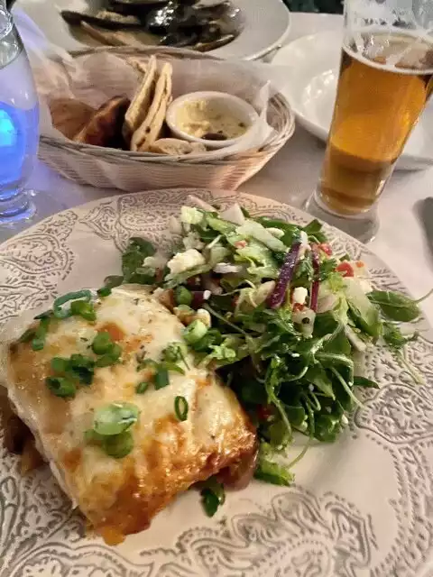 Food and service was good. The moussaka was good with lots of meat, but not cheesy. The accompanying salad was needed a better dressing. The whole fish was very good as were the greens. The pasta with fish was excellent. Service was very good and there was a decent Greek wine list.