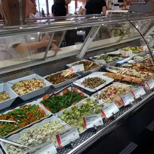 Lots of fresh and premade options. Employees were friendly. There was lots of seating. Only negative is you don't know the prices until it's time to pay. Pizza crust was a bit chewy, wedge salad did not have enough items on it and calamari was flavorful and crispy but very overpriced and a bit oily. Seems to stay busy.