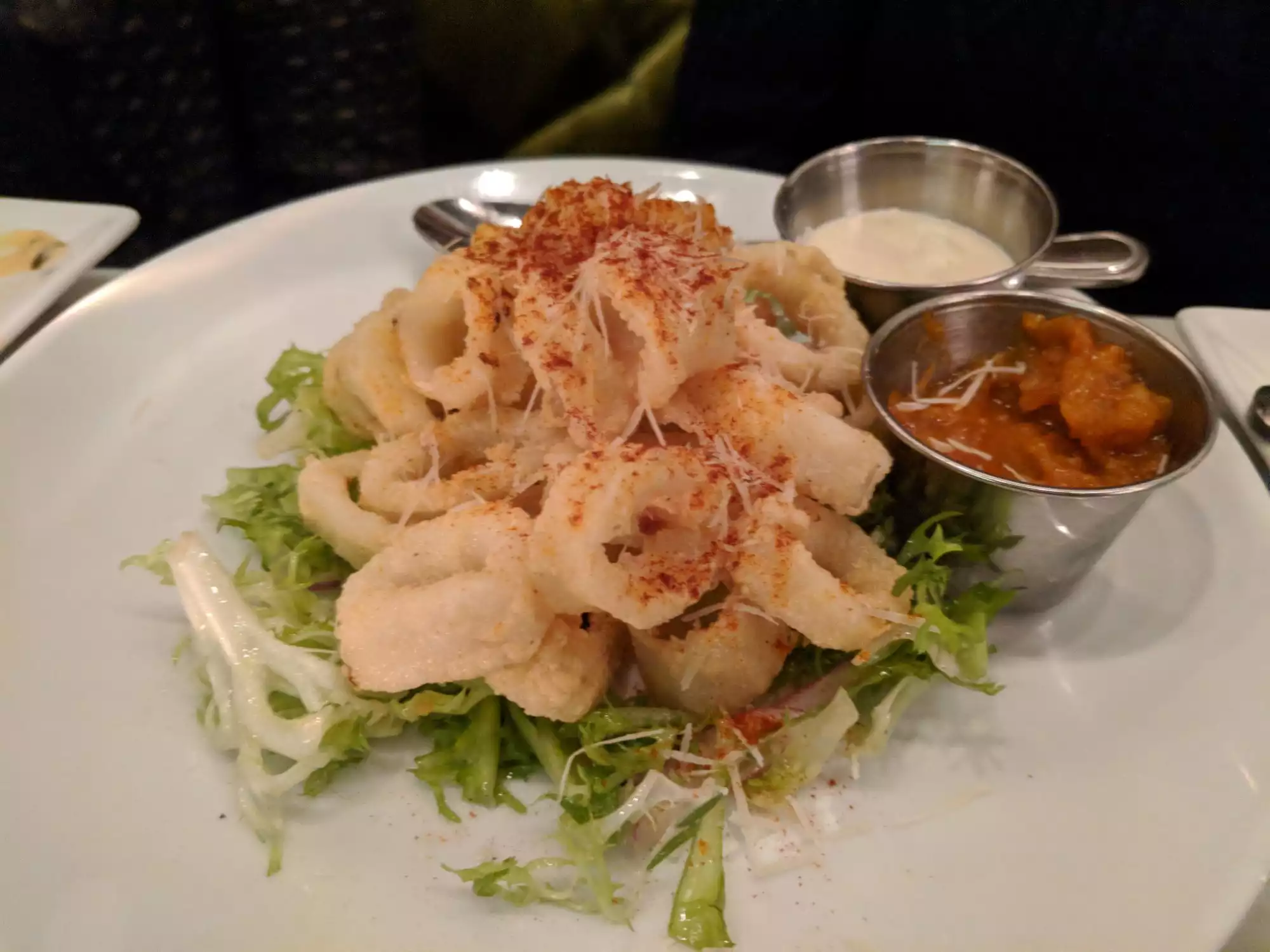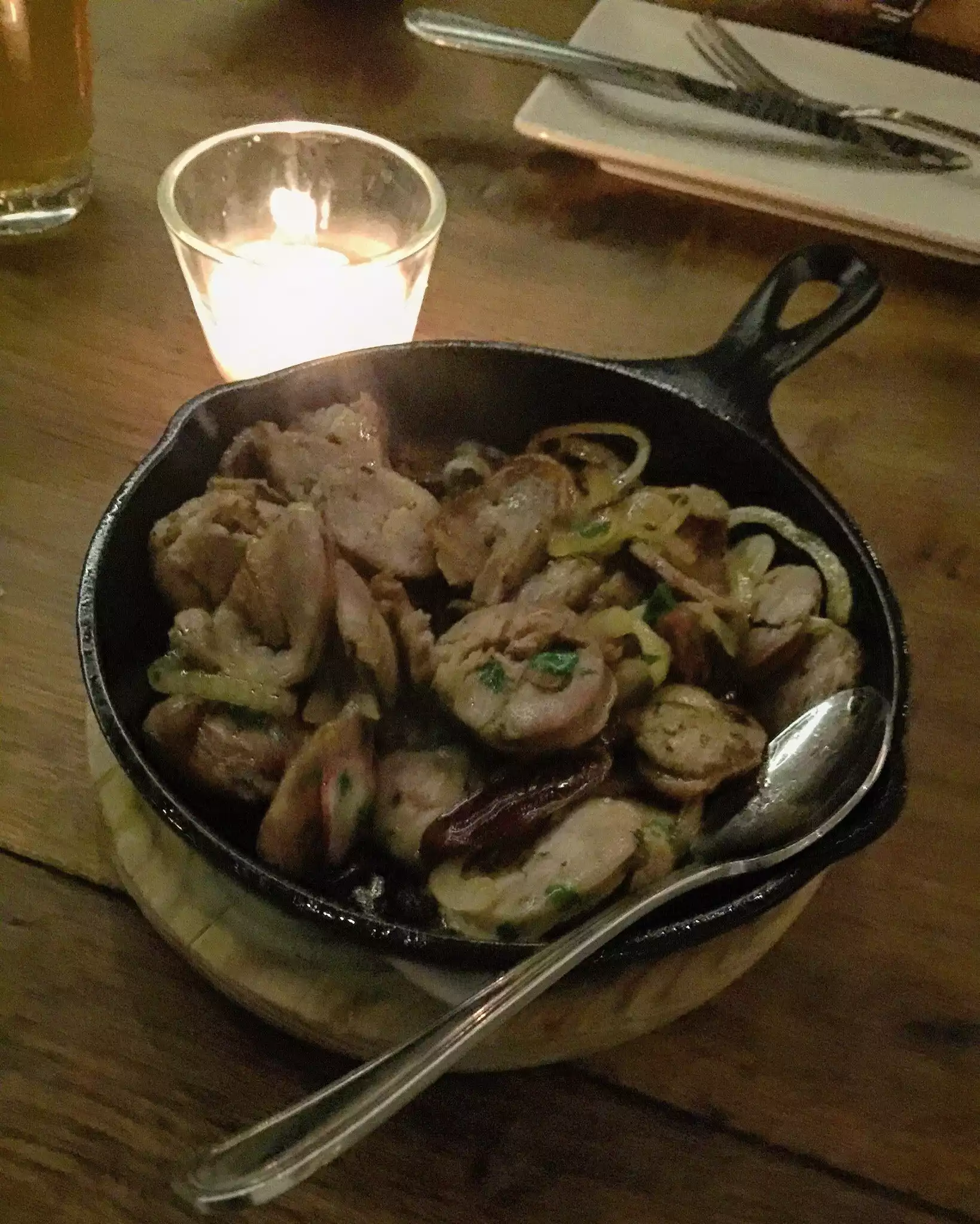Three of us at dinner and we got 5 plates to share and a few Ciders. Shrimp, brussels, mushrooms and steak were very tasty but small portions on baby skillets. Don't waste your money on the calamari. Nothing special, very ho hum. Wait staff was not warm or friendly, but delivered our asks without mistakes and food arrived quickly. All in all we enjoyed our meal, but the bill was high and we left still hungry.
